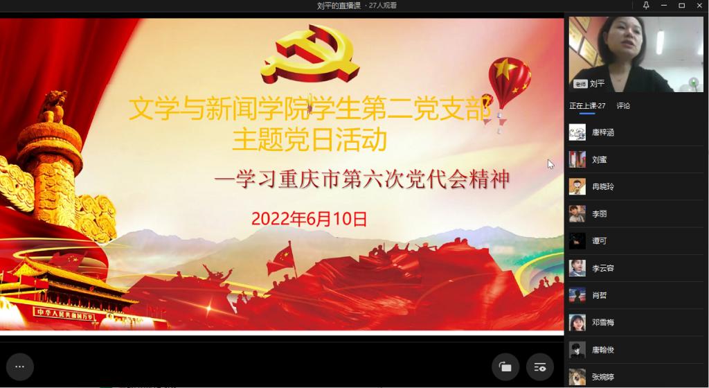会上,刘平老师对重庆市第六次党代会概况进行了介绍, 她提到,重庆市第六次党代会,是在党的二十大即将召开,我市奋进社会主义现代化建设新征程关键时期召开的一次重要会议。这次大会,将坚持以习近平新时代中国特色社会主义思想为指导,坚定不移沿着习近平总书记指引的方向前进。会议全面回顾过去五年的奋斗历程,系统总结这些年的成绩经验,科学谋划今后五年发展的思路目标和重点举措,为书写重庆全面建设社会主义现代化新篇章而努力奋斗。二支部作为高校的基层党组织,将深入学习市第六次党代会精神,立足老员工们的学习生活,不断开拓创新,继续发扬真抓实干的作风,继续发挥战斗堡垒作用,为重庆全面建设社会主义现代化贡献力量。