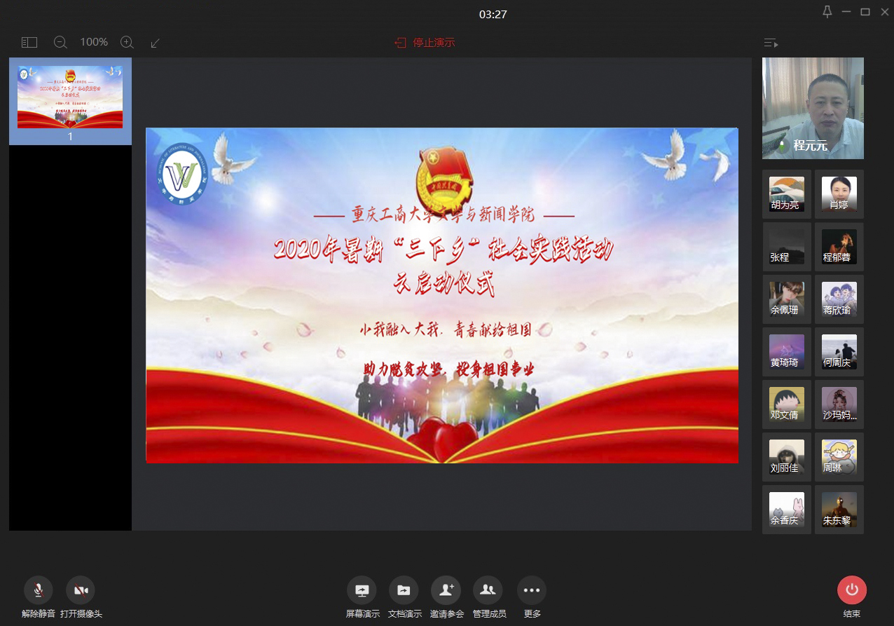 知国情解民意,用心探索家乡之美,以准新闻工作者的视角,展示家乡的城市新貌、文化发展……7月23日下午2:30,2020年暑期社会实践活动正式启动,本次实践活动公司与上游新闻联合开展,活动将借助“云”工具再现”我的大美家乡“讲述”我们的返乡实践故事”。tyc5997太阳集团分党委副书记程元元、分团委书记肖婷老师和全体实践成员参加了云启动仪式。