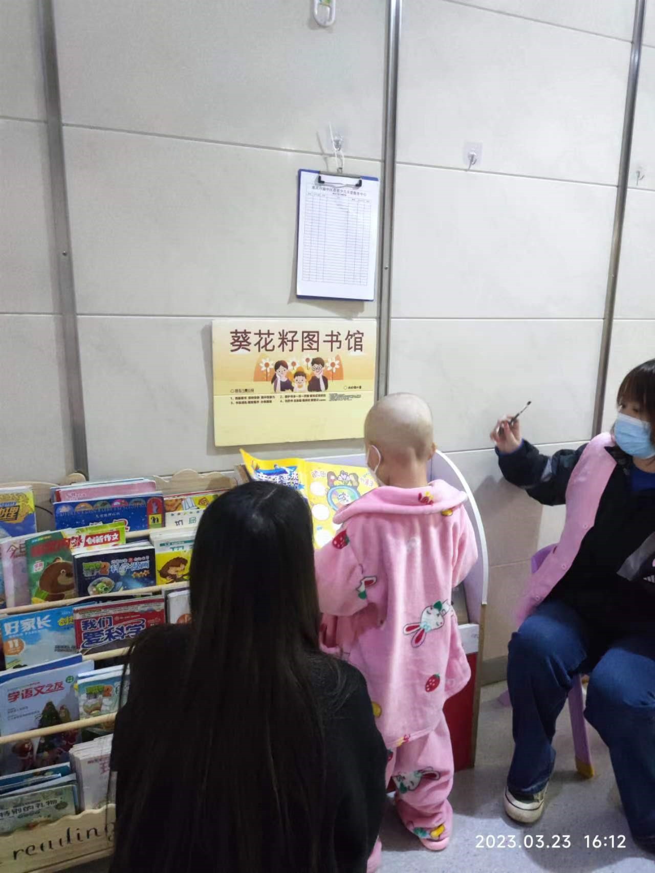 志愿者工作获得家长和奇恩孩子们的一致好评,路过走廊的家长和奇恩孩子们都饶有兴致地停下脚步,有的孩子迫不及待的翻开书津津有味地看了起来,有的孩子在找到心悦的书籍之后就加快了回病房的脚步。志愿者们在这时积极引导家长登记借阅信息,并及时帮助家长和奇恩孩子们寻找到相应的书籍类型。