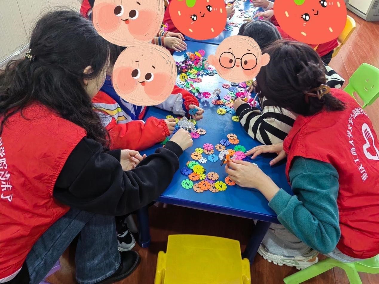 志愿者们提前帮孩子们把气球打好气,等待孩子们下课和孩子们一起玩游戏。之后,志愿者们和孩子们一起上手工课,和他们一起拼雪花片积木。孩子们的动手能力非常强,不一会儿就拼出了他们天马行空想象出来的作品。他们开心地和志愿者们分享自己所拼出来的作品,又和志愿者们一起拼出了许多的作品。下课后,孩子们不舍地和志愿者们挥手告别。