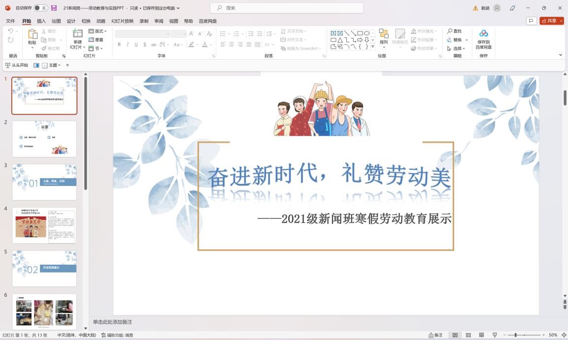 本次活动共收到了同学们的劳动实践材料和创作作品36份和9个班级提交的PPT等作品。其中在班级参赛中多个班级积极制作宣传“劳动教育与实践”的PPT,举办劳动教育知识班会,鼓励同学们踊跃参加线下劳动实践活动,从小事做起,从身边做起。在个人参赛项目中同学们也积极结合自身专业优势,参加各种形式活动,如:打卡本人日常生活劳动照片、制作社会实践劳动Vlog、制作宣传“劳动”的海报图、撰写劳动教育与实践的感想等,以多种方式体验劳动生活并分享自己的劳动成果,使其具备良好的劳动品质,充分发挥劳动教育实践活动的价值。
