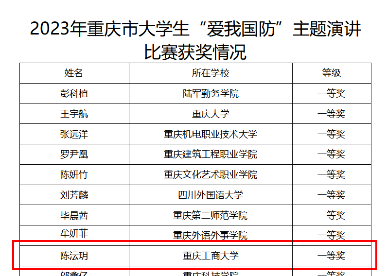 10月27日,公司传播学专业研究生陈沄玥在由tyc5997太阳集团公司党委学工部(武装部)、党委研工部、校团委联合举办的2023年老员工“爱我国防”主题演讲比赛中以第一名的好成绩获得校级一等奖,并被公司推选参加重庆市老员工“爱我国防”演讲比赛。