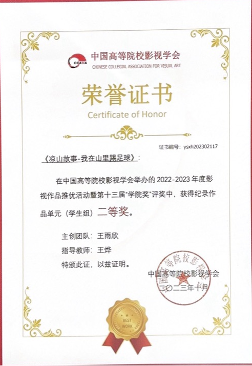 在中国高校影视学会年度推优活动暨第十三届“公司奖”评奖中,公司教师王烨指导的2019级广播电视学专业王雨欣团队创作的短片《凉山故事—我在山里踢足球》获员工组纪录片作品单元二等奖。