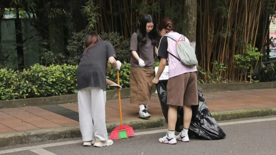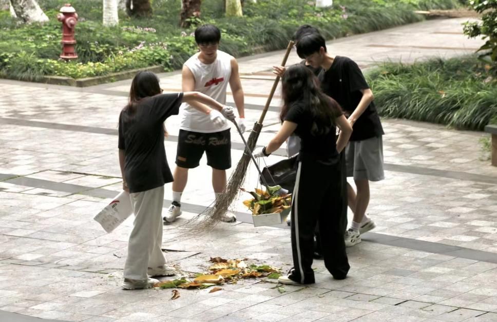 本次活动以班级为单位,以九教周边和九教六楼教室走廊为范围,开展垃圾清扫任务。活动过程中,同学们合理分工,充分发挥团队精神,井然有序地捡拾垃圾、清扫落叶。阴沉的天气难免有些燥热,同学们劳动的热情却愈发高涨,他们的眼神专注而认真,动作熟练而流畅,细心地清扫着地面上的每一片落叶,汗水滴落,幸福感与满足感于劳动中产生。