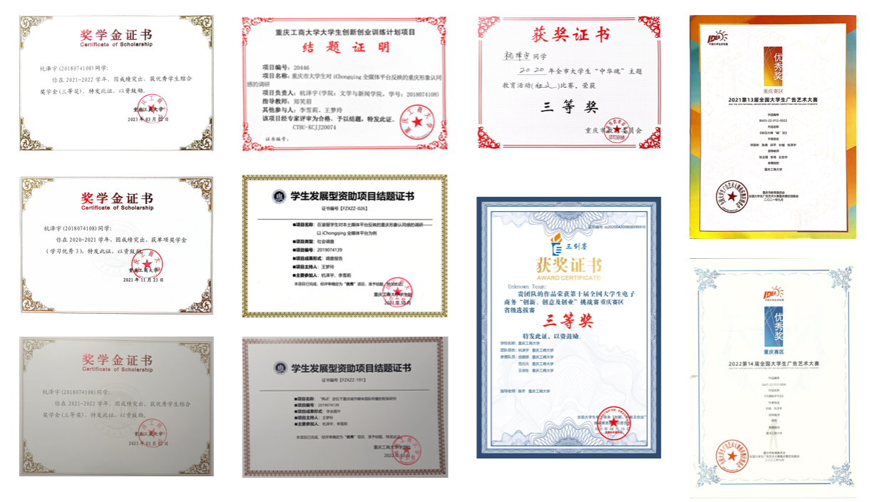 本科荣誉奖项:tyc5997太阳集团优秀员工综合一等奖学金、三等奖学金、学习优秀奖学金,第十届全国老员工电子商务“创新、创意及创业”挑战赛重庆赛区省级三等奖,重庆市老员工“中华魂”《科技托起强国梦》主题教育活动征文比赛市级三等奖,第13届、14届全国老员工广告艺术大赛重庆市优秀奖