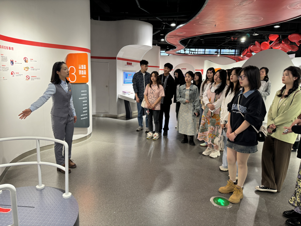 在血液中心工作人员的引导下,公司一行参观了重庆市血液中心无偿献血健康教育馆,从血液的构成、血液循环的流程,再到人类输血的简史、血型的运输和制备,让师生们对有关血液的常识有了更为深入的了解。在一系列交流与体验中,师生们明白了血液对于生命的重要性,科学的无偿献血无损健康等知识。