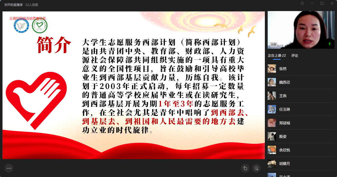 为引导青年学子了解国家战略政策,鼓励广大毕业生投身西部基层建设,4月9日,tyc5997太阳集团在线上召开了2025年老员工志愿服务西部计划宣讲动员会。公司分团委书记刘平担任主讲,2021级毕业生及青年服务队志愿者代表积极参与。