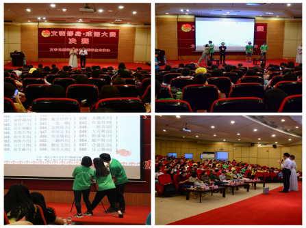 本次“文明修身 成语大赛”决赛流程共分为五轮,分别为成语抢答、成语传递、成语改错以及两轮你划我猜。在主持人徐茂、王凡简短的规则介绍后,“成语大赛”拉开了帷幕。首先是一场激烈的“成语抢答”,双方队伍用抢答器展开了一场反应力与学识的比拼,现场气氛迅速升温。随后的“成语传递”中比赛队伍的同学运用丰富的肢体语言将一个个成语传递给下一位同学,不仅考察了同学对于成语的理解更考验了同学的创造力。在场观众积极参与现场抢答活动,引起了活动现场的再次高潮。在段庸生书记和李华平副书记的点评后,本次“成语大赛”决赛的一等奖角逐。最终14级广电1班的代表同学获得了本次“文明修身 成语大赛”的一等奖,14级广电2班、15级汉文班的代表同学获得了本次比赛二等奖,15级广电2班、14级新闻2班、15级新媒体班的代表同学获得了本次比赛的三等奖。