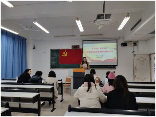 首先,张小焕老师向参会党员传达了会议精神,详细介绍了“不忘初心,牢记使命”专题组织生活会和民主评议党员大会会议流程。接着,支部书记代表支委会向到场党员报告一年来党支部工作情况特别是开展主题教育和学习贯彻党的十九届四中全会精神情况,对照检查支委会班子存在的问题。