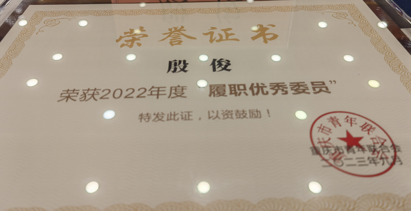 重庆市青年联合会开展了表彰2022年度优秀会员团体、履职优秀界别工作委员会和履职优秀委员的推选活动,共有14个团体、6个界别工作委员会、103位个人获奖。公司经理殷俊教授荣获“2022年度履职优秀委员”荣誉。