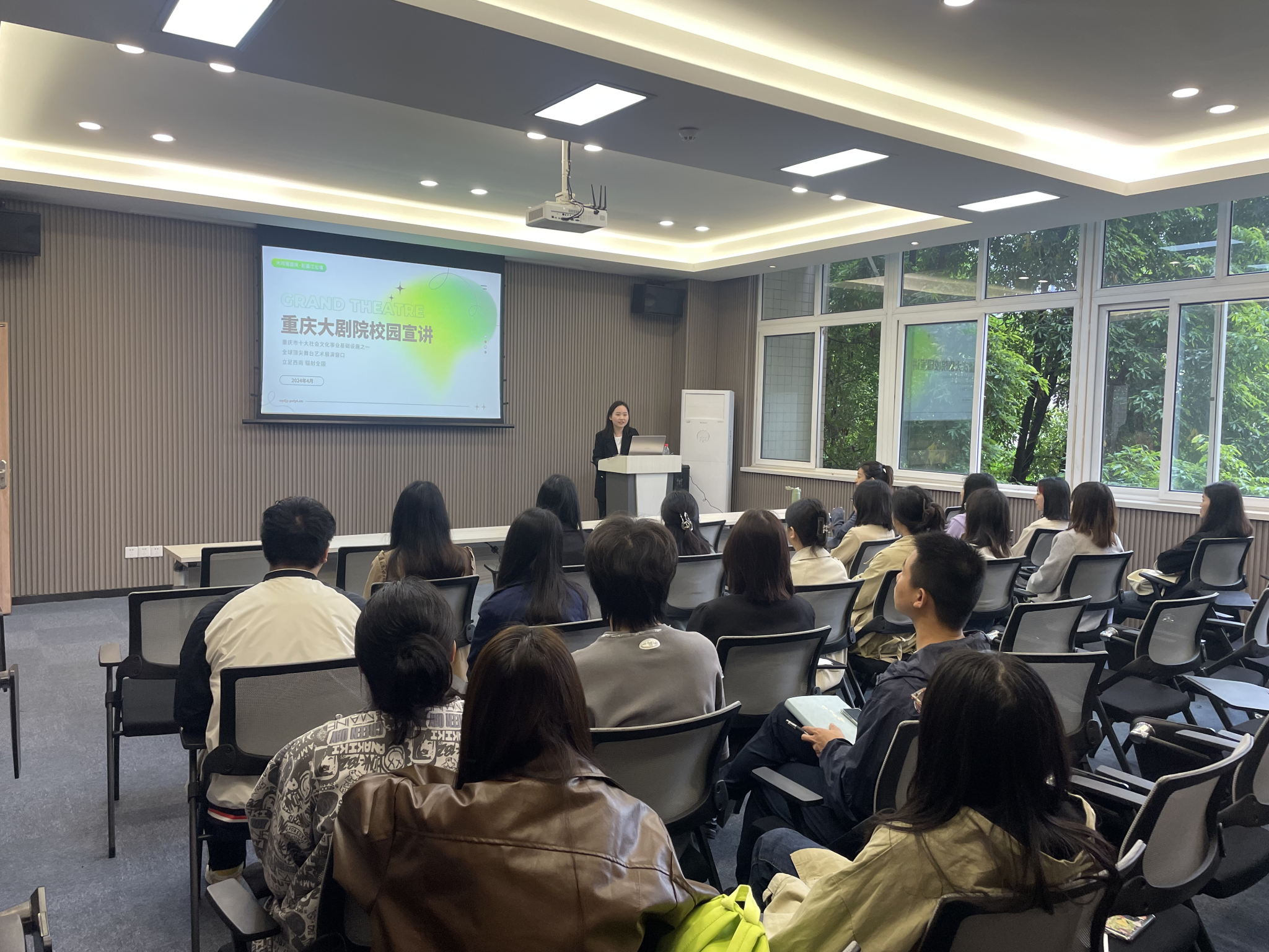 座谈会结束后,重庆市保利文投剧院管理有限公司在慧智楼90529多功能厅召开招聘宣讲会,首先由重庆大剧公司党建人事负责人张丹妮(2016届广播电视学员工)进行宣讲,为到场的同学们介绍了大剧院目前的总体情况及岗位需求。