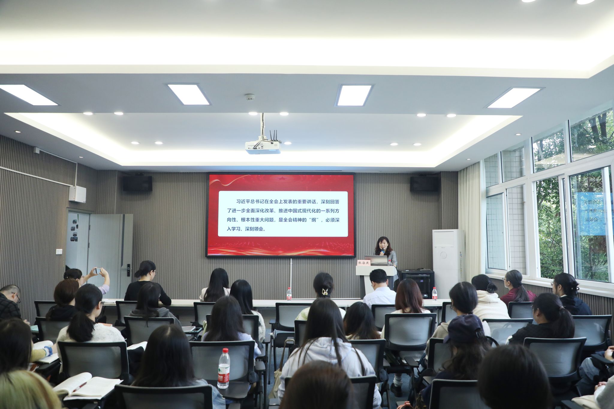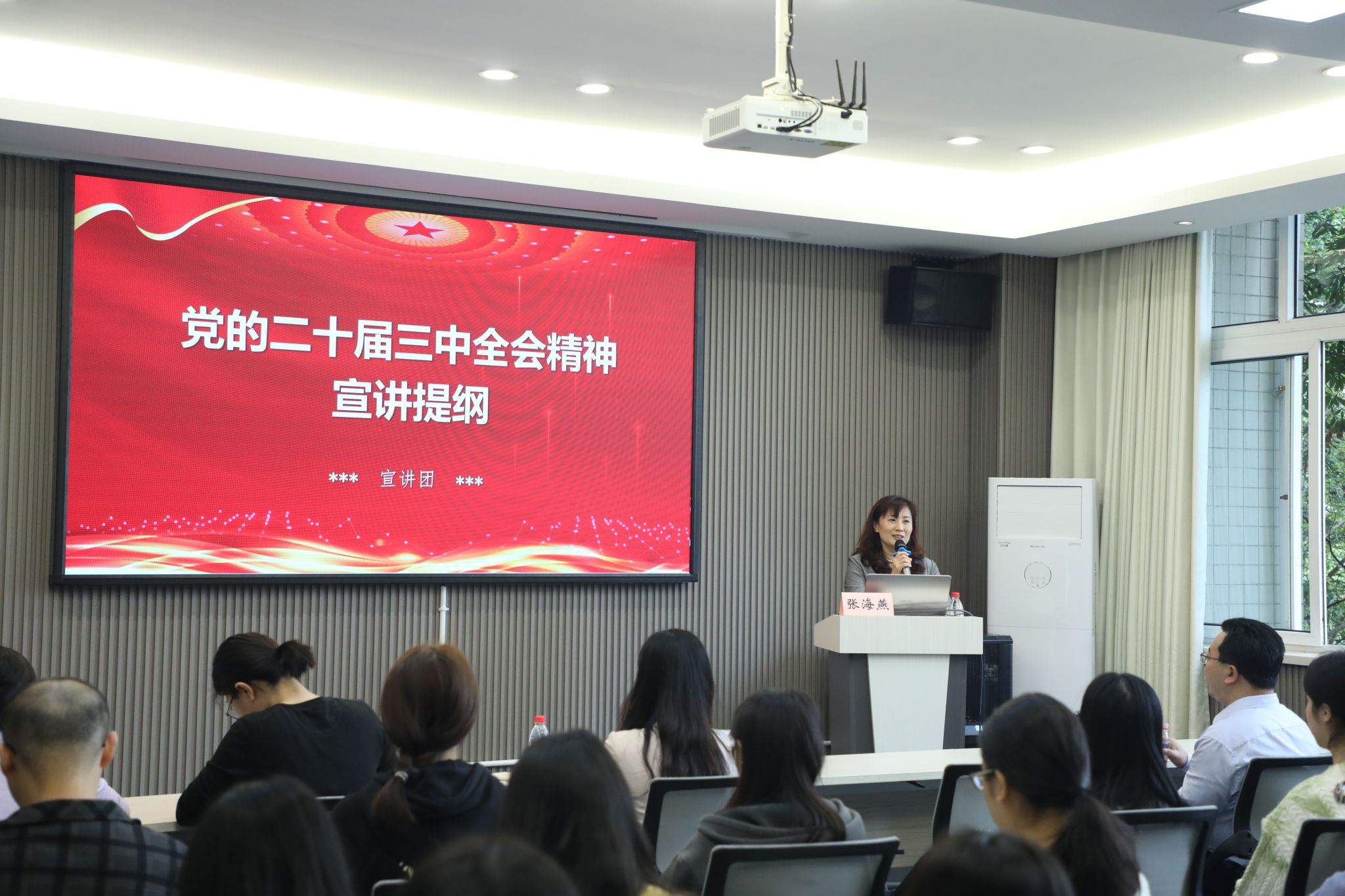 10月14日上午,公司宣讲团成员、纪委书记张海燕在慧智楼90529学术厅作学习贯彻党的二十届三中全会精神宣讲报告,机关党委第二支部人员,公司领导班子全体成员、师生党员代表、入党积极分子代表共计50余人到会聆听了宣讲。宣讲会由公司党委书记潘焱主持。