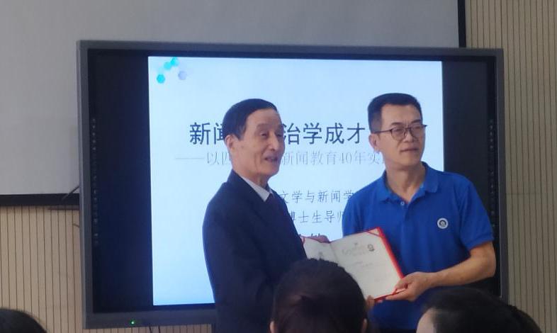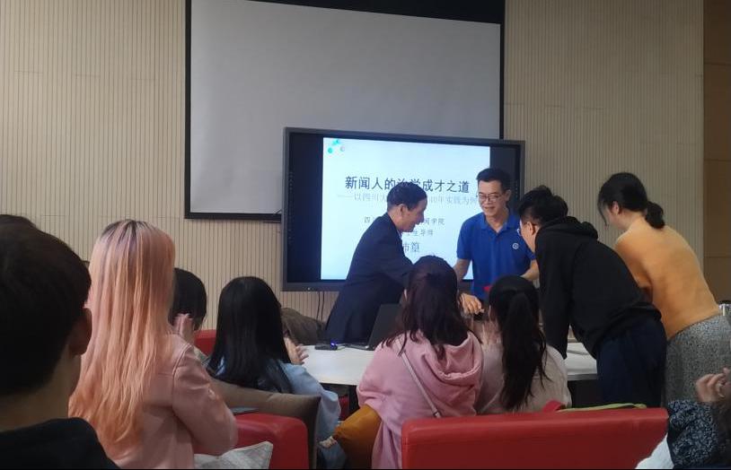 讲座中,邱沛篁教授介绍了四川大学新闻学子毕业后所从事的工作领域与职业,回顾了四川大学新闻学专业从筹备、招生、再到今天的蓬勃发展,每一步都走得不容易。谈到新闻学子如何成才,邱教授结合自身职业生涯强调:作为一名新闻人,必须热爱自己从事的新闻事业,为之奋斗;有高度的政治敏感和新闻敏感,善于挖掘日常生活中有价值的新闻话题;扎实学好新闻学专业理论,勤奋刻苦;坚持不懈,锲而不舍;勇于创新,走在时代前列。