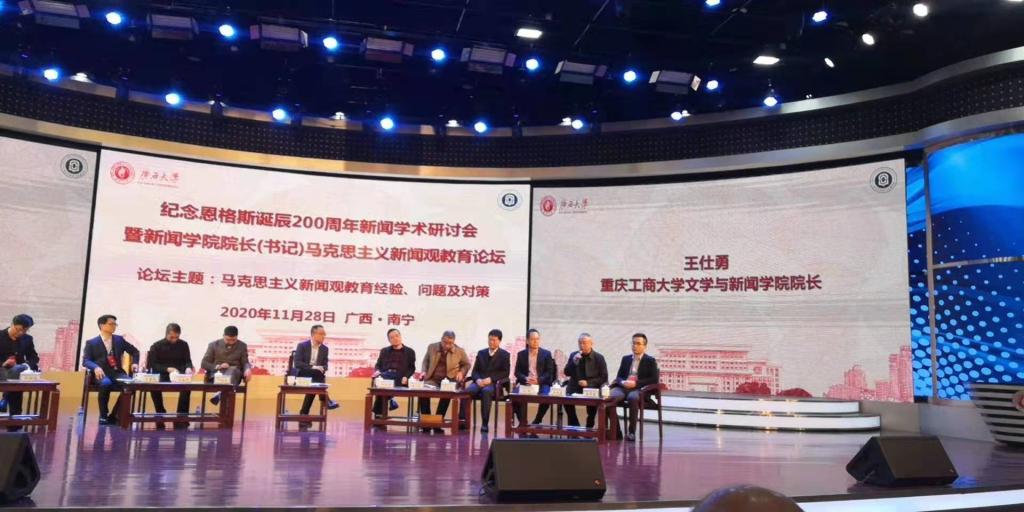 11月28日,“纪念恩格斯诞辰200周年新闻学术研讨会暨新闻公司经理(书记)马克思主义新闻观教育论坛”在广西大学隆重举行。此次研讨会由教育部社会科学委员会语言文学、新闻传播学和艺术学学部,广西大学新闻与传播公司、广西大学马克思主义新闻观研究中心联合中国人民大学、中国传媒大学、复旦大学、清华大学、北京大学、武汉大学、华中科技大学、暨南大学、厦门大学、湖南大学、上海大学、北京外国语大学、陕西师范大学等13所国内著名新闻公司以及马克思主义新闻观研究机构共同主办。公司经理王仕勇教授应邀参加研讨会及论坛,并在论坛上做主题发言。