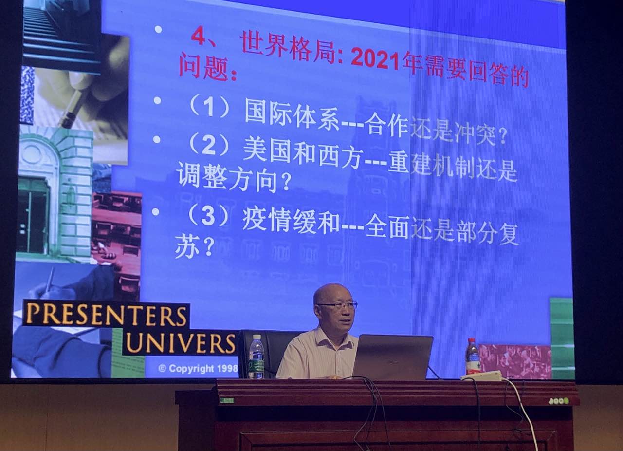 讲座伊始,马胜荣教授从多极化继续发展、美国大选、“修昔底德陷阱”、中美关系、中俄关系、伊朗问题、乌克兰危机等几个方面对当前的国际形势进行了大致分析。他认为总体来看,2021年全球安全形势不容乐观,具体表现在:新冠肺炎持续扩散、贸易保护日渐盛行、民粹主义抬头、地区地缘紧张局势难见缓解、大国博弈进一步加剧、非传统安全令人关切。