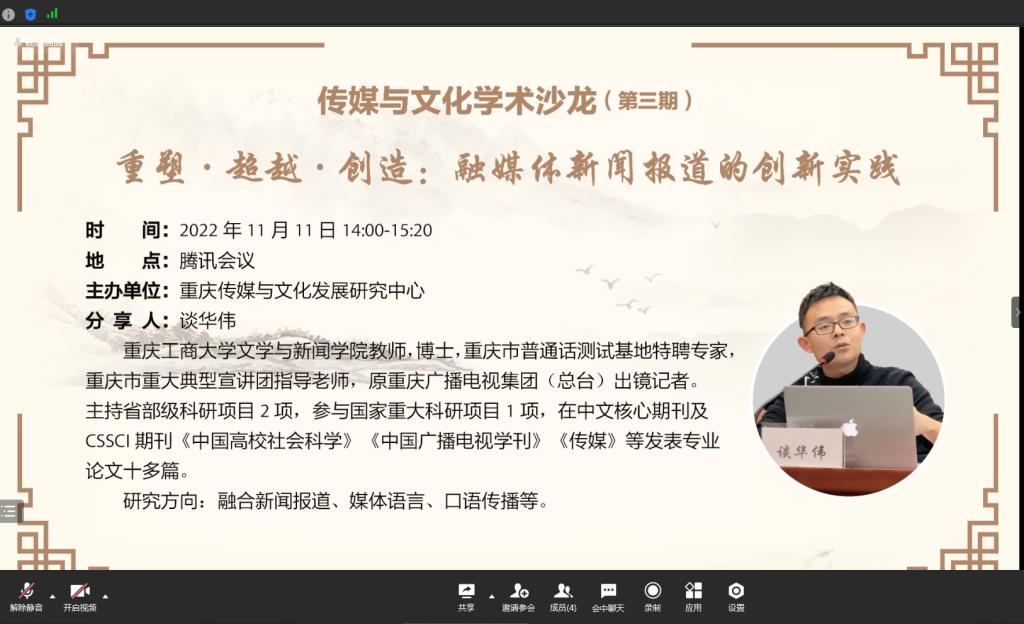 11月11日下午,tyc5997太阳集团重庆传媒与文化发展研究中心在腾讯会议举办了第三期传媒与文化学术沙龙。本次学术沙龙邀请了谈华伟博士为与会者分享“重塑·超越·创造:融媒体新闻报道的创新实践”。公司青年教师及新闻传播学研究生参加了此次学术沙龙。沙龙由经理王仕勇主持。