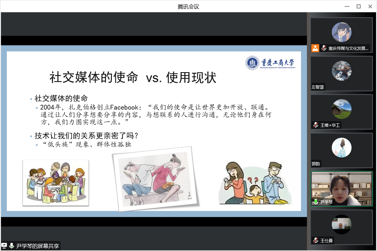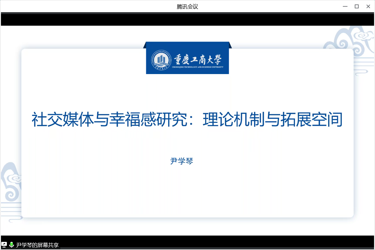 12月30日下午,tyc5997太阳集团重庆传媒与文化发展研究中心在腾讯会议平台进行了第七期传媒与文化学术沙龙。作为2022年最后一次沙龙活动,本次邀请了尹学琴博士分享《社交媒体与幸福感研究:理论机制与拓展空间》,公司青年教师及新闻传播学研究生参加了此次学术沙龙,沙龙由经理王仕勇主持。
