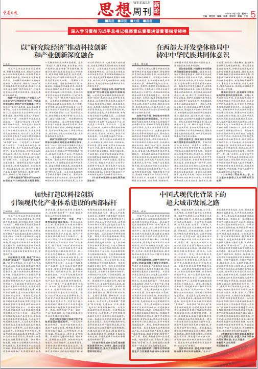 5月27日,《重庆日报》思想周刊刊登了公司经理殷俊教授撰写的题为《中国式现代化背景下的超大城市发展之路》的理论文章。