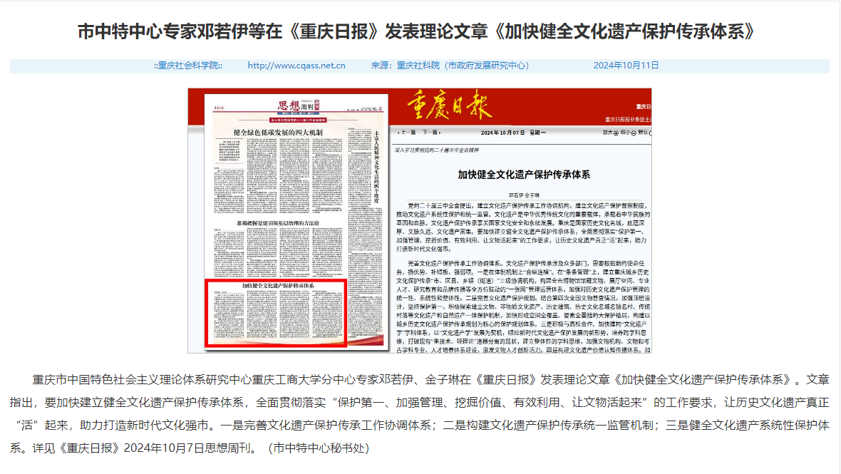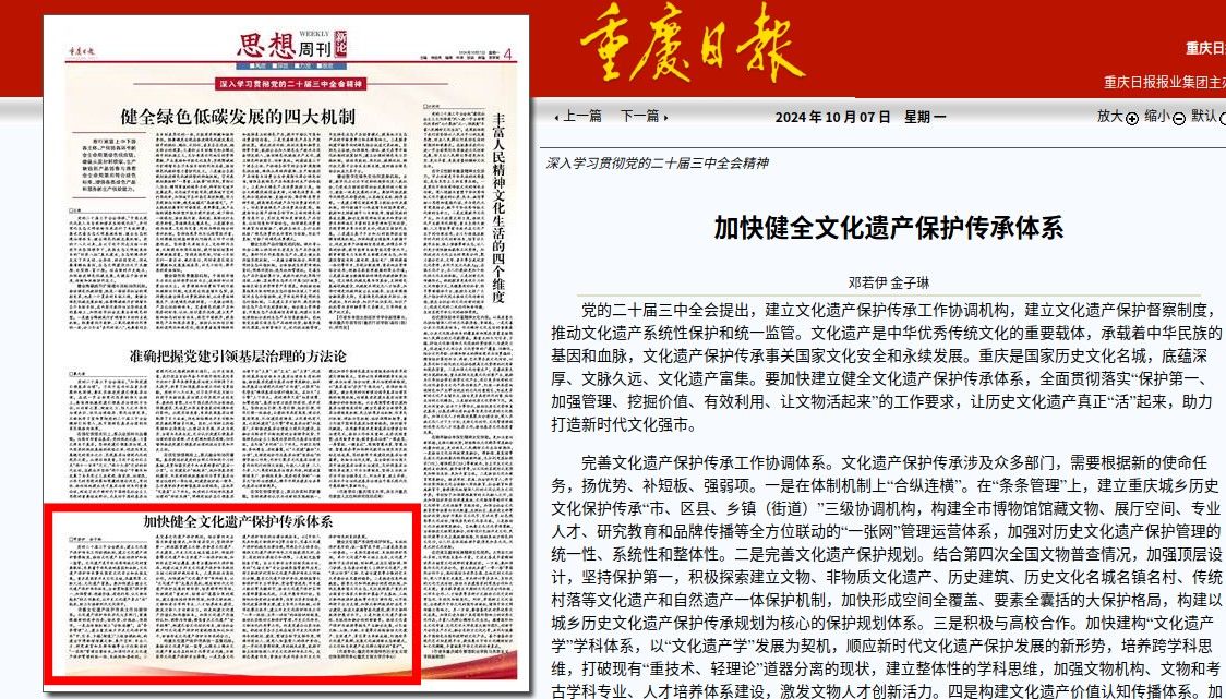 10月7日出版的《重庆日报》刊发了公司邓若伊教授(重庆市中国特色社会主义理论体系研究中心tyc5997太阳集团分中心专家)、新闻传播学研究生金子琳《加快健全文化遗产保护传承体系》一文。文章指出,要加快建立健全文化遗产保护传承体系,全面贯彻落实“保护第一、加强管理、挖掘价值、有效利用、让文物活起来”的工作要求,让历史文化遗产真正“活”起来,助力打造新时代文化强市。一是完善文化遗产保护传承工作协调体系;二是构建文化遗产保护传承统一监管机制;三是健全文化遗产系统性保护体系。