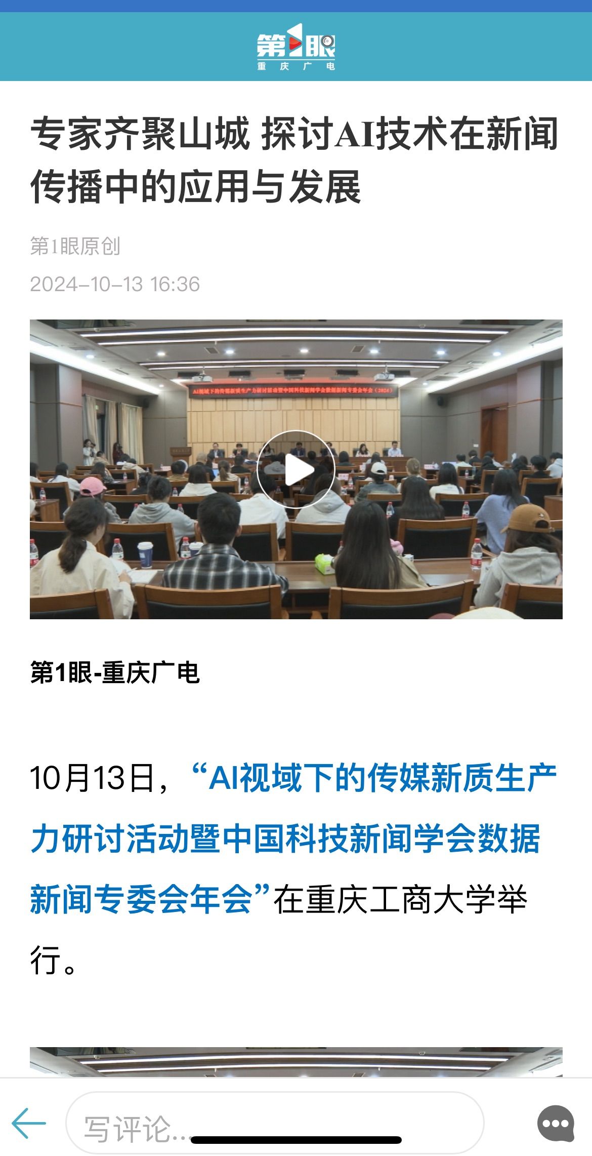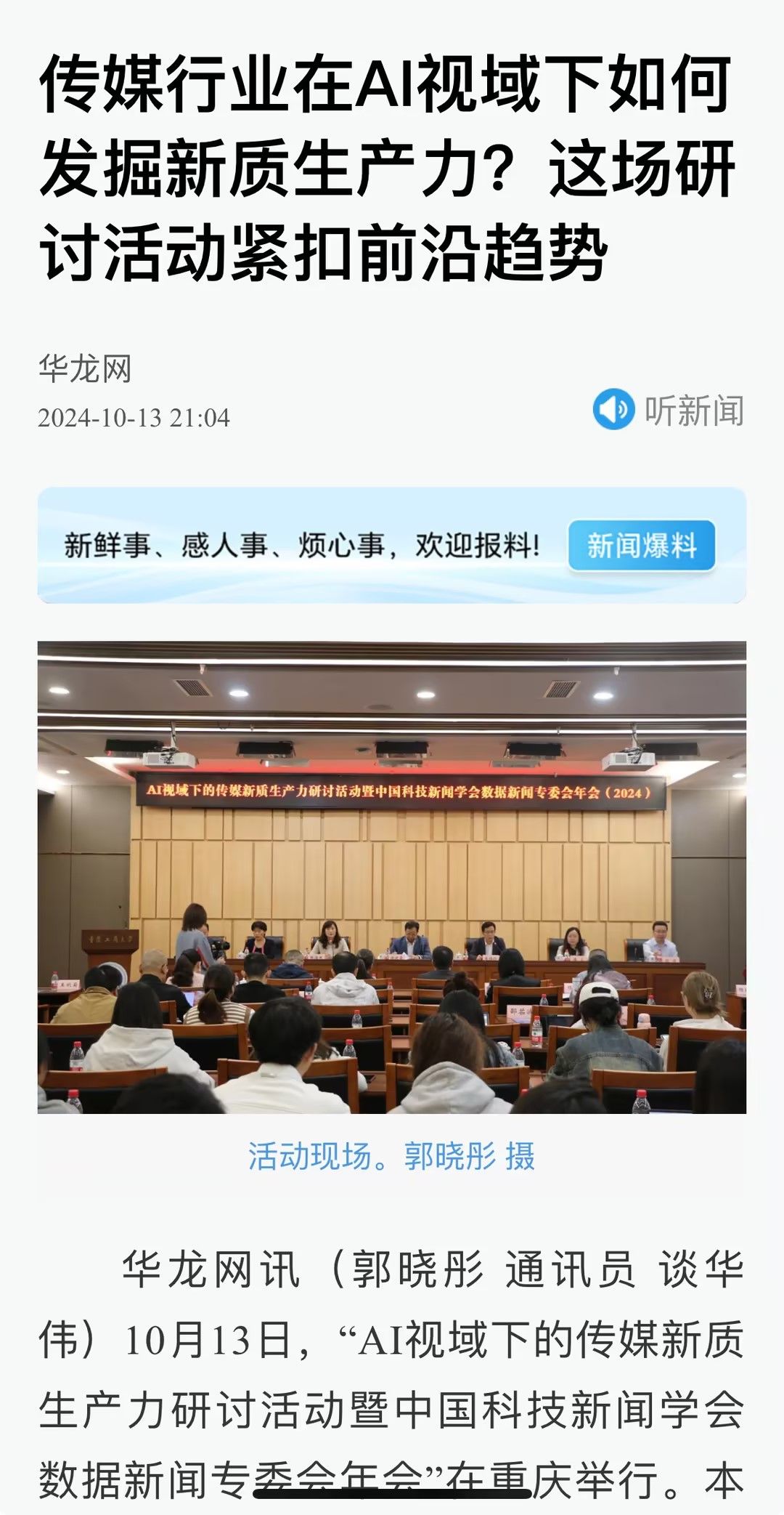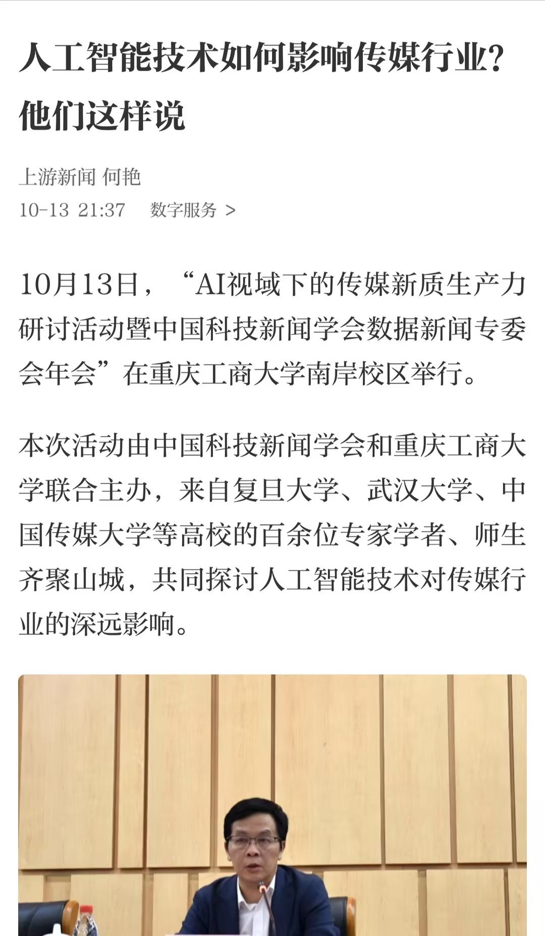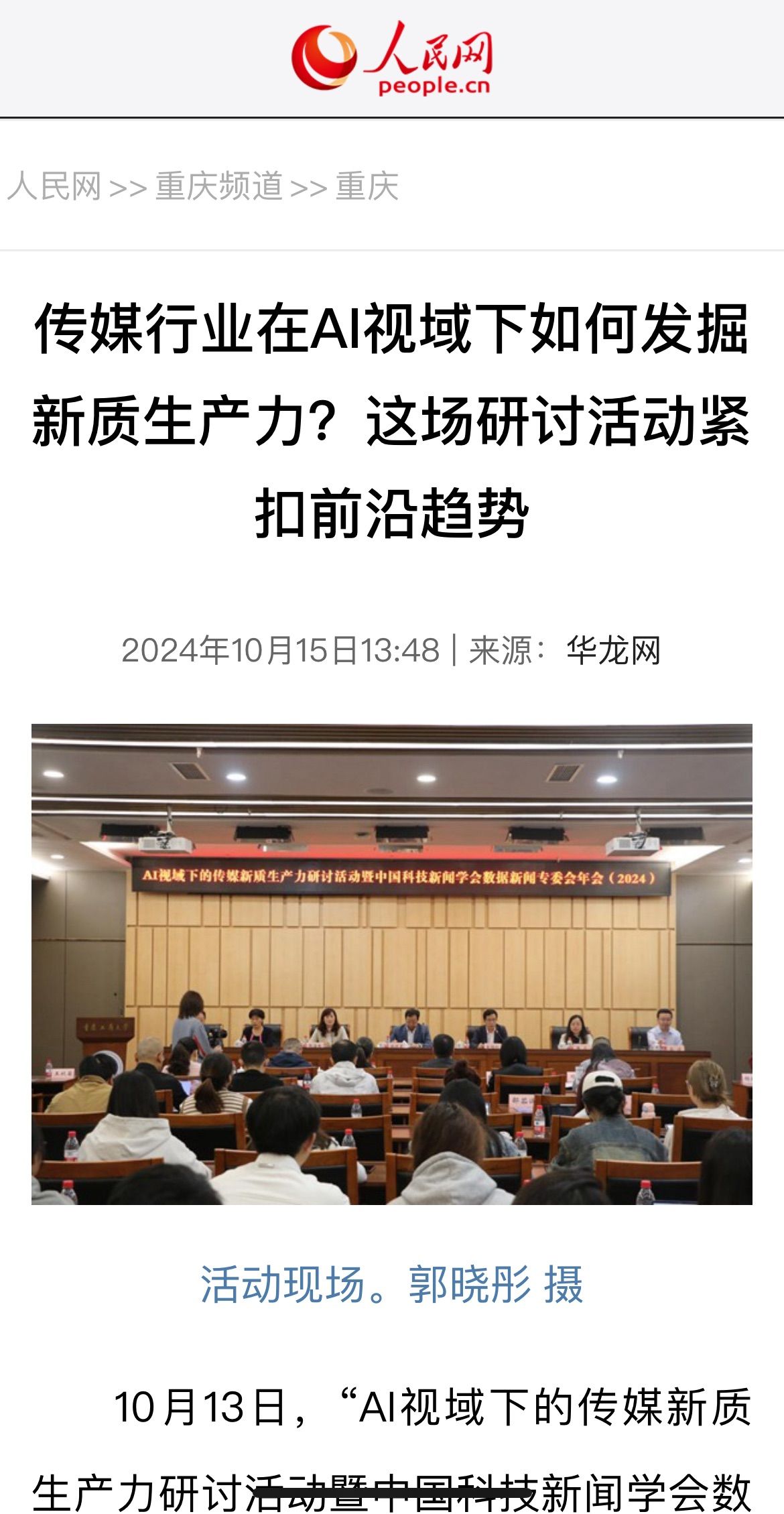 近日,人民网以《传媒行业在AI视域下如何发掘新质生产力?这场研讨活动紧扣前沿趋势》为题;科学网以《人工智能技术对传媒行业有何影响?专家学者这样说》;重庆电视台以《专家齐聚山城 探讨AI技术在新闻传播中的应用与发展》;华龙网以《传媒行业在AI视域下如何发掘新质生产力?这场研讨活动紧扣前沿趋势》为题;上游新闻以《人工智能技术如何影响传媒行业?他们这样说》为题;光明网以《中国科技新闻学会数据新闻专委会年会在重庆举行》为题;人民政协报以《“AI视域下的传媒新质生产力研讨活动暨中国科技新闻学会数据新闻专委会年会”在重庆举行》为题分别报道了10月13日公司召的“AI视域下的传媒新质生产力研讨活动暨中国科技新闻学会数据新闻专委会年会”。