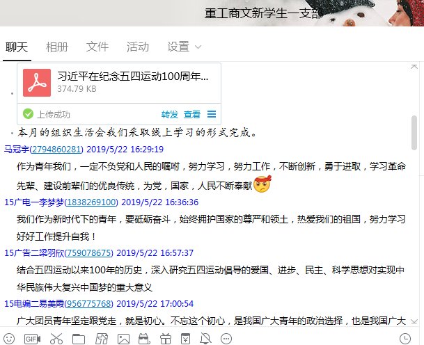 线上,支部成员通过QQ群认真学习习近平总书记在纪念五四运动100周年大会上的讲话内容,积极发言。15电编三班赵又漫同志说到:“千里之行,始于足下,只有认真干好手里的每一项工作,才能收获自我价值实现的愉悦,收获个人不断成长的欣喜,更好地为服务人民”;15广电二班贾荣莎呼吁支部成员,作为新时代青年,一定紧跟着党和时代的步伐,砥砺奋斗,在实践中成长,练就过硬本领,用青春装点祖国的未来。