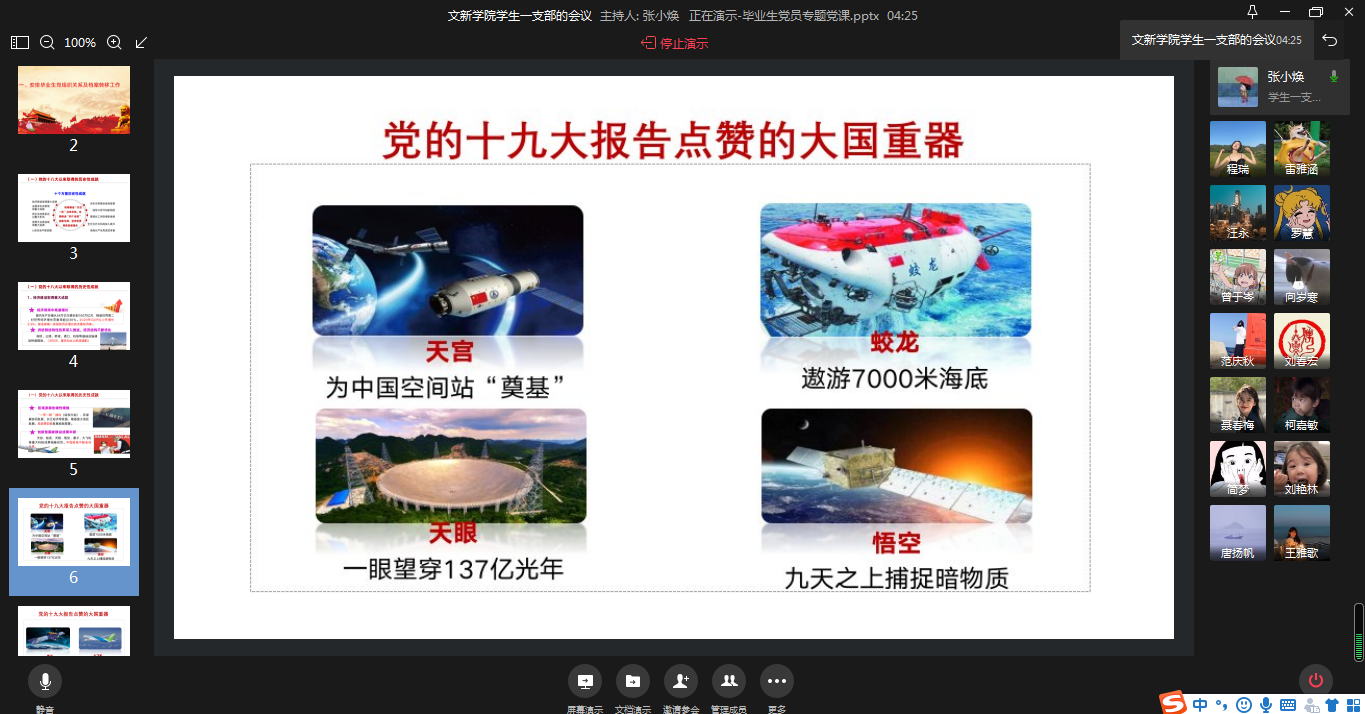 此次学习教育活动分为两个议程。首先,支部书记张小焕同志为全体党员做了“砥砺奋进明初心 青春使命勇担当”的专题党课,张老师通过讲授党的十八大以来,我国在经济建设、深化改革、民主法治、思想文化、人民生活、生态文明等十个方面历史性所取得的历史性成就;十九大以来,在以习近平同志为核心的党中央的正确领导下,创新驱动发展战略大力实施,创新型国家建设成果丰硕,天宫、蛟龙、天眼、悟空、墨子、大飞机等重大科技成果相继问世,总结只有在中国共产党的领导下,在新时代坚持和发展中国特色社会主义,才能齐心协力走向中华民族伟大复兴的光明前景。张老师寄语毕业生党员,离校不离党,在未来的工作岗位上积极参加党内生活,提高党性修养。加强理论学习,坚定理想信念。做到思想进步、政治可靠,成为祖国和革命事业的栋梁之才。