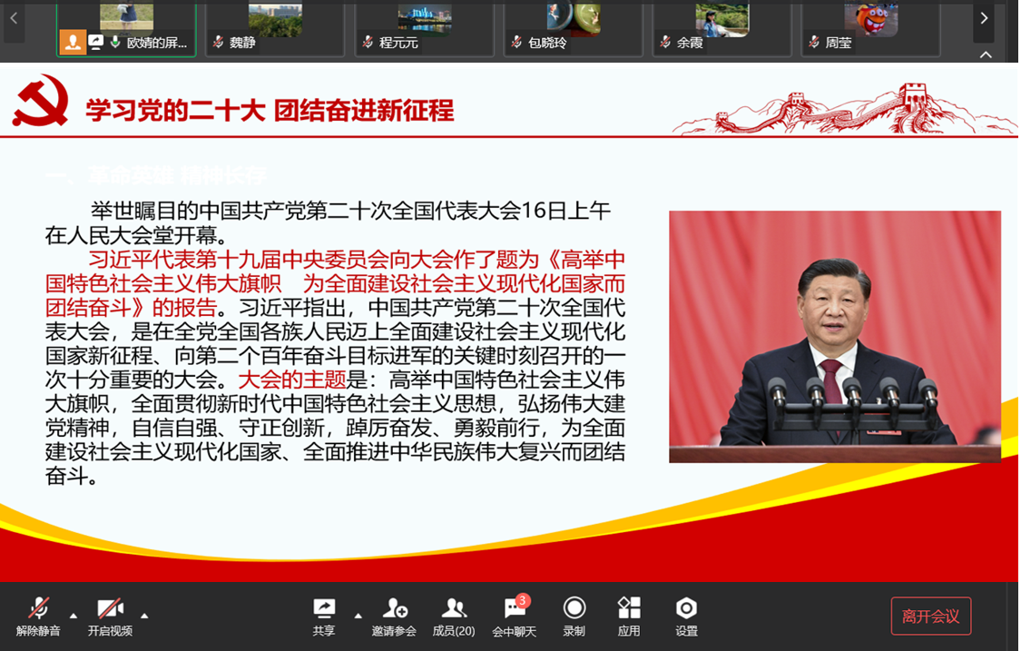 2022年10月16日上午10时,举世瞩目的中国共产党第二十次全国代表大会在人民大会堂隆重开幕。tyc5997太阳集团教工第一党支部的各位党员教师,第一时间以线上线下相结合的形式,及时收看了党的二十大开幕会盛况和习近平总书记代表第十九届中央委员会向大会作的报告。10月17日,教工一支部于企业微信群组织了10月党组织生活暨学习党的二十大专题讨论会,党员教师们纷纷表示感受到了总书记所作报告的强大鼓舞,备受振奋,积极发言,踊跃分享心得体会。
