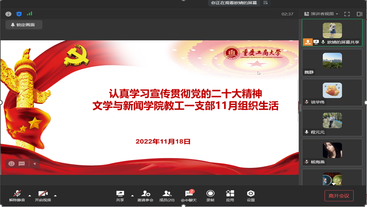 11月18日,文学与新闻公司教工一支部以线上党员大会的形式开展“认真学习宣传贯彻党的二十大精神”组织生活集中学习,由支部书记欧婧主持。