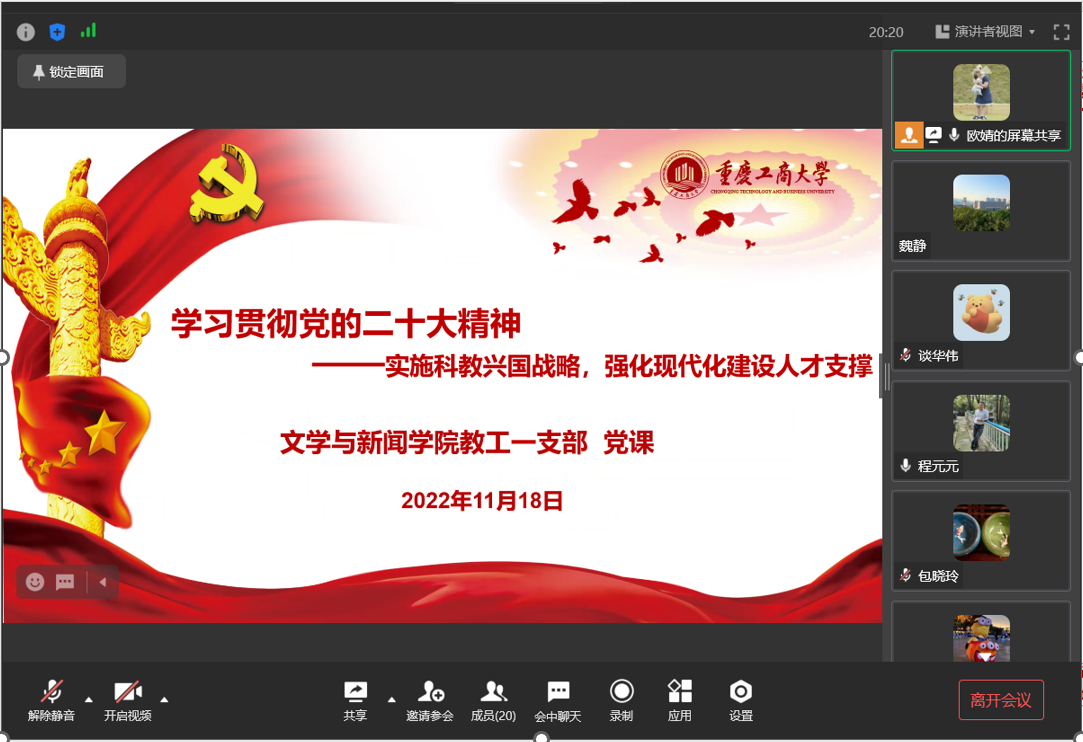 11月18日下午,文学与新闻公司教工第一党支部通过企业微信在线会议的形式,开展了学习贯彻党的二十大精神专题党课,由支部书记欧婧主讲,专题党课以党的二十大报告中的第五部分“实施科教兴国战略,强化现代化建设人才支撑”为主题,支部全体党员教师参加了党课学习。