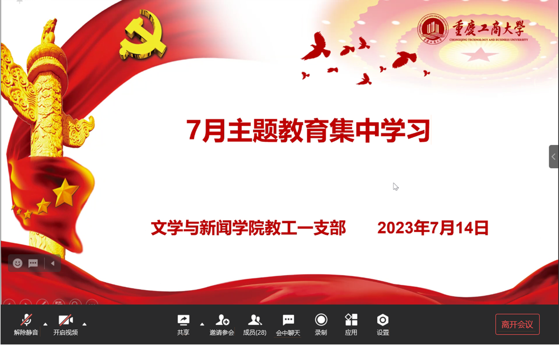 2023年7月14日下午,tyc5997太阳集团教工第一党支部开展7月组织生活,包括开展学习贯彻习近平新时代中国特色社会主义思想主题教育理论学习,及时跟进学习了习近平总书记关于主题教育的最新重要讲话指示精神,推进主题教育走深走实,并开展红色博物馆系列主题党日活动等,由支部书记欧婧主持。
