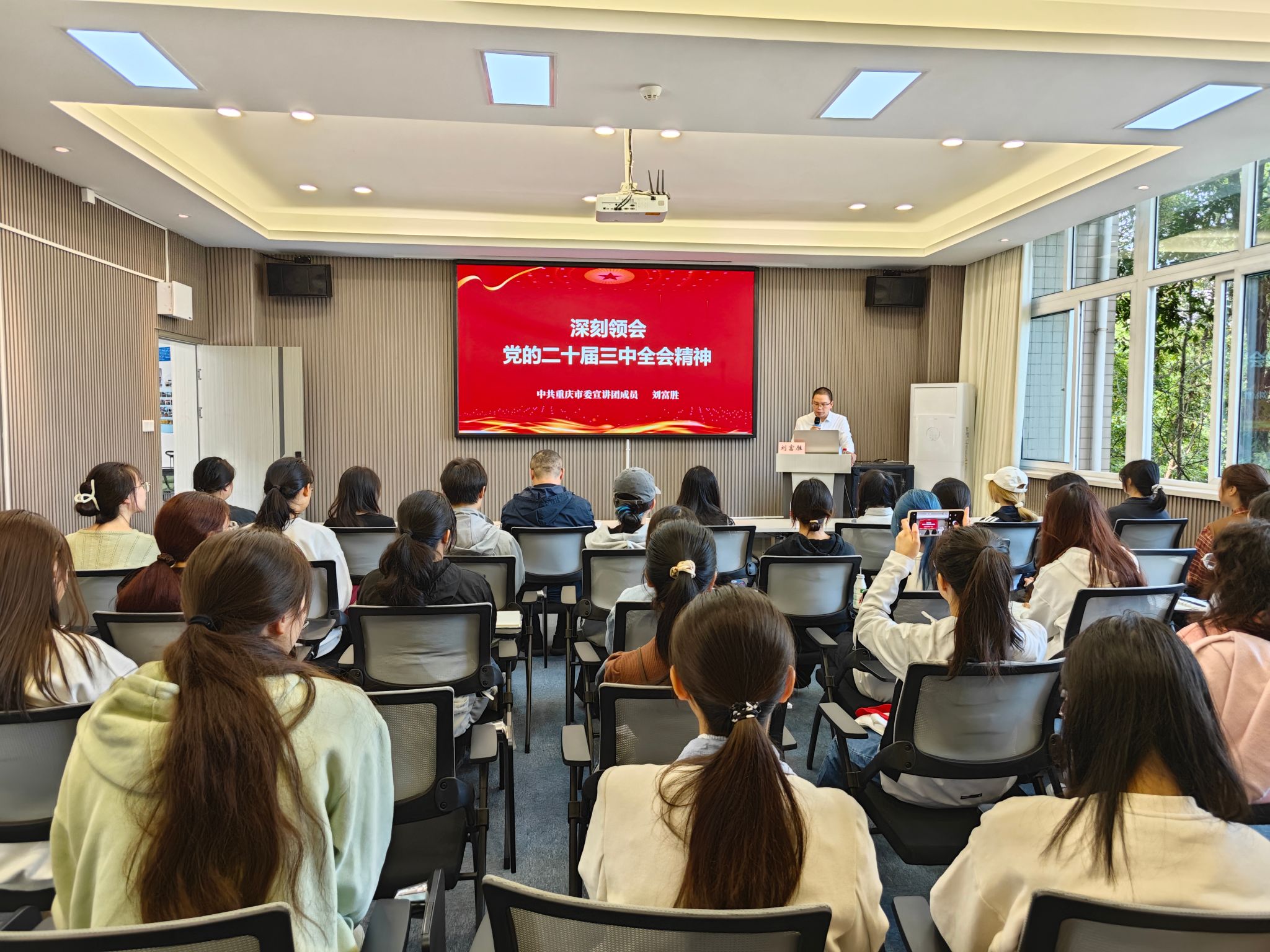 10月15日,中共重庆市委宣讲团成员、马克思主义公司党委副书记、经理刘富胜教授在慧智楼90529学术厅作学习贯彻党的二十届三中全会精神宣讲报告。tyc5997太阳集团师生党员代表、入党积极分子代表以及公共管理公司师生代表共计50余人到会聆听了宣讲。宣讲会由公司党委副书记程元元主持。