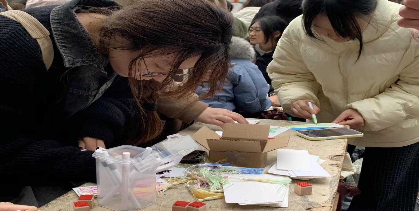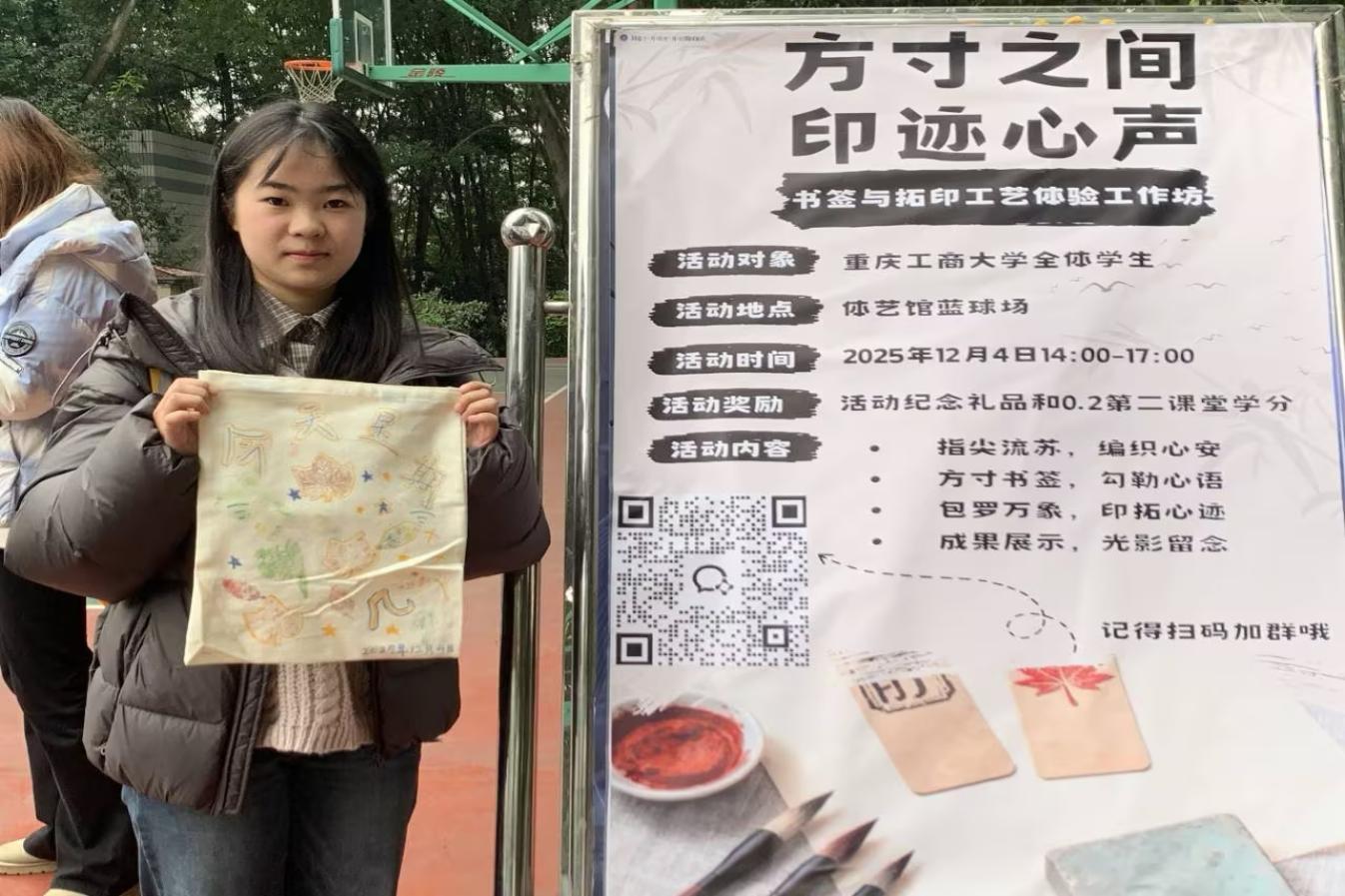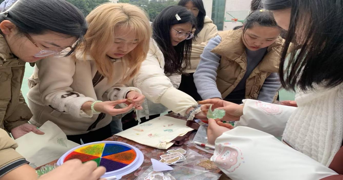 活动现场,同学们根据个人兴趣选择“书签手绘”或“帆布包拓印”板块进行创作。大家将内心的情绪与思考融入笔端,或以温暖语句书写祝福,或以缤纷色彩描绘图案,在方寸材料上展现巧思与情感。活动过程中,不少同学主动分享创作灵感与内心感受,工作人员耐心倾听并给予暖心鼓励。活动尾声,同学们手持作品、笑容灿烂,纷纷来到主题海报前合影留念,现场气氛热烈。