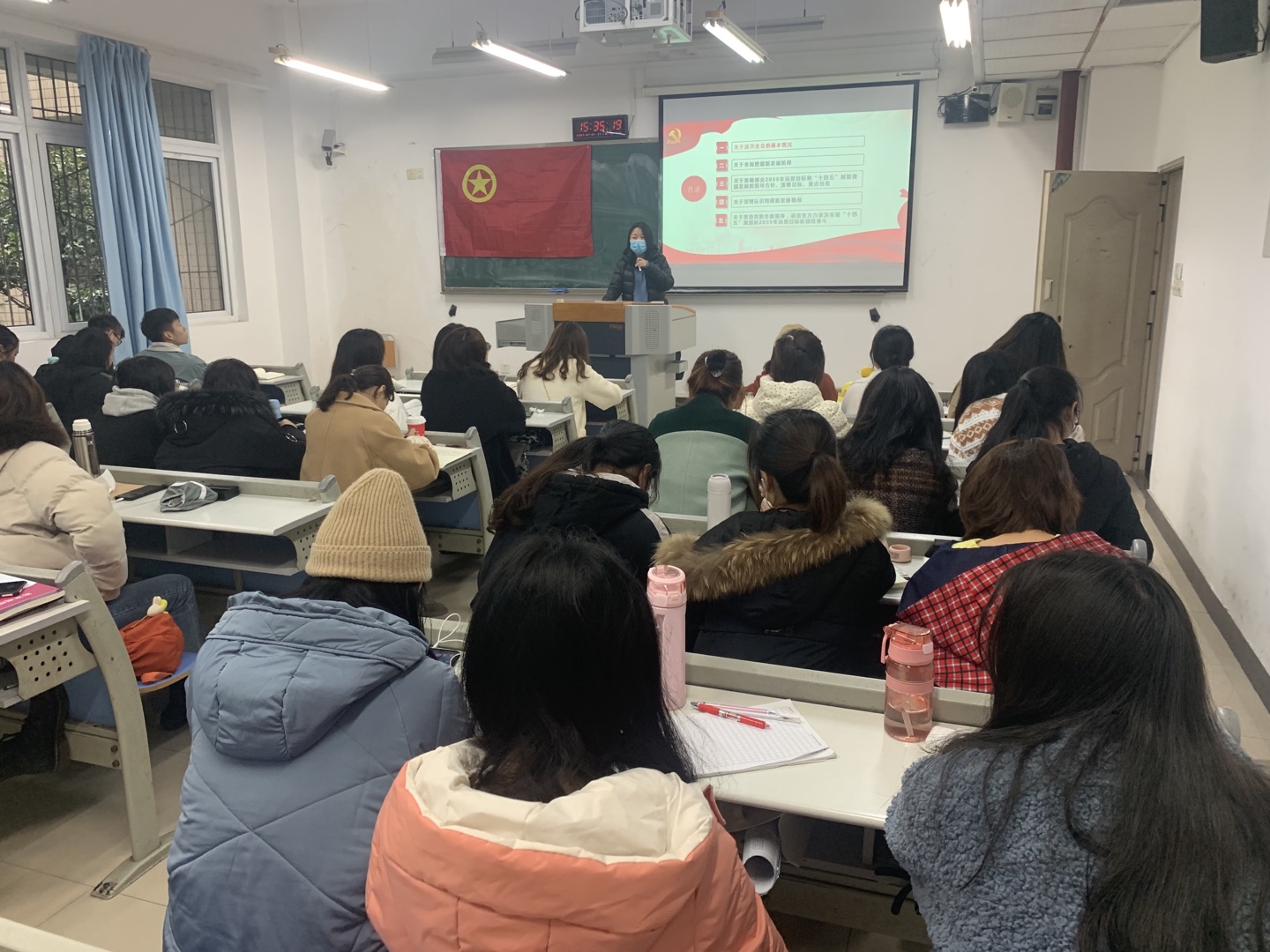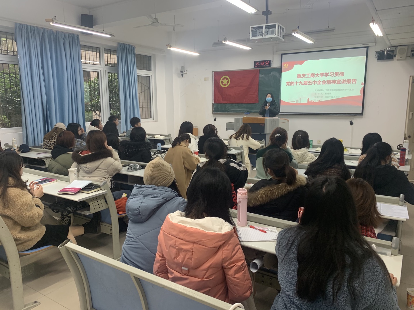 2020年12月10日下午,辅导员杜建清在慧智楼90202教室对2019级新闻学专业一支部的同学进行了“学习贯彻党的十九届五中全会精神”的宣讲。