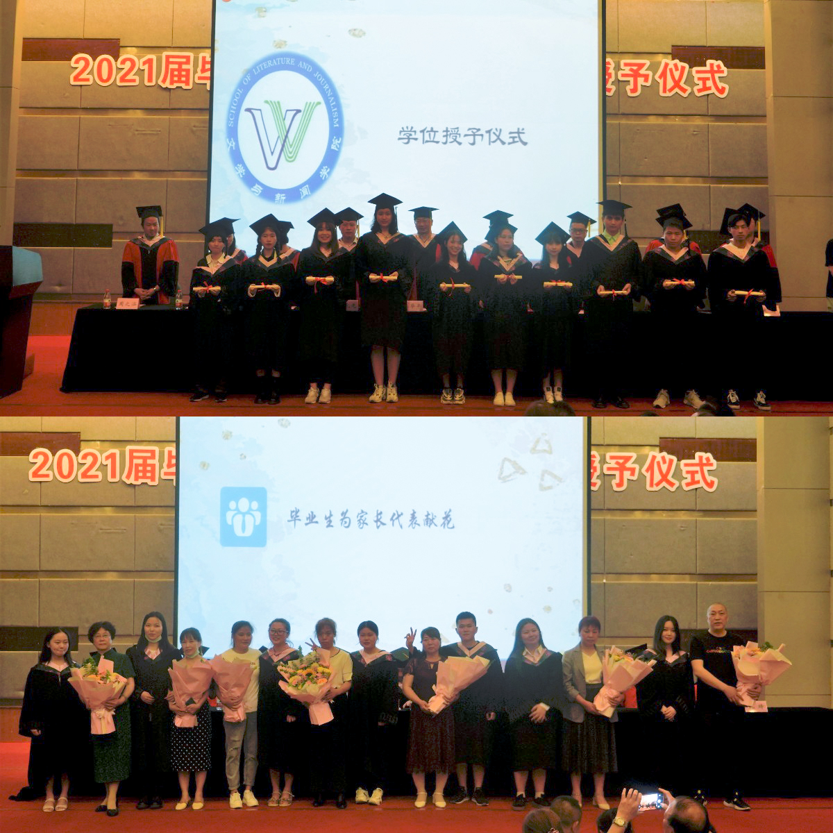 典礼上,毕业生代表向教师代表、辅导员老师代表和管理服务老师代表献上鲜花。部分员工家长应邀观礼并上台接受同学的鲜花和拥抱。