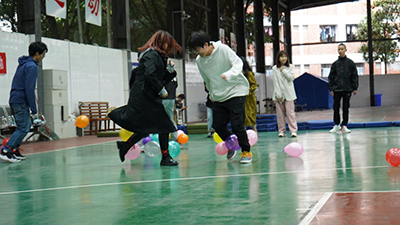 踩气球环节中,每个队伍派出4个人,每个人拿四个气球,在脚踝处分别绑两个气球;大家分散在规定的区域内,发令后,双方队员在保护好自己的气球不被对方踩破的前提下,千方百计地踩破对方队员的气球。此游戏中充分调动了同学们的积极性,游戏显得紧张刺激,现场的笑声接连不断。