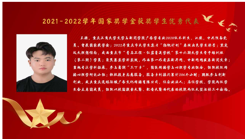 王澈,tyc5997太阳集团广告学专业2020级本科生,汉族,中共预备党员。曾获国家奖学金;2022年重庆市老员工实习“扬帆计划”表现出色员工;坚定远大理想信念,成为重庆市“青马工程·红岩菁英公司”第十六期老员工骨干培训班(第二期)学员;聚焦落实学科实践,作为第一作者在新华网、中新网发表新闻文章;专注学科拓展,前往忠县磨子乡参与暑期“三下乡”,前往重庆市文化和旅游发展委员会参与专业实习,围绕传播学与心理学专业组合,组织传播心理学研究小组;积极投身志愿服务,服务乡村振兴累计206小时;踊跃参与创新创业,成立重庆通屿际域广告文化传播有限公司,任企业法人;历任公司、公司两级员工会主席团成员,组织以校园提案大赛、配音大赛为代表的校院两级大型活动三十余场。