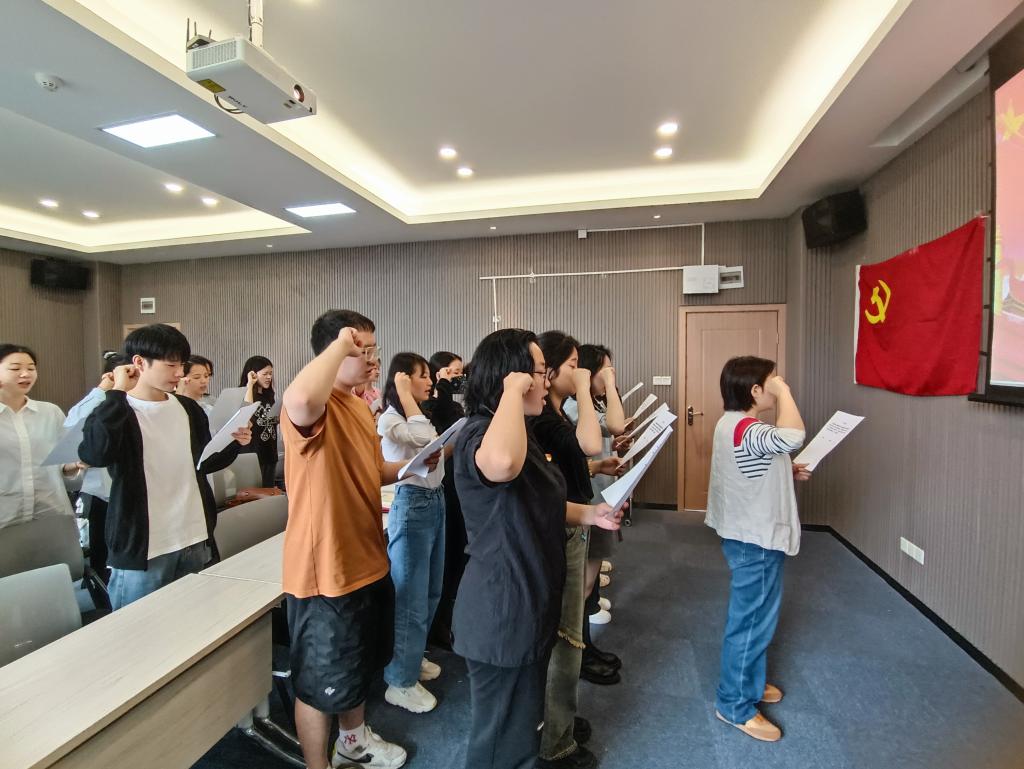 最后,刘平老师带领全体成员在党旗下重温入党誓言。在一声声铿锵有力,语气坚定的宣誓声中,毕业生党员们们带着对母校的不舍和祝福结束了此次党课。