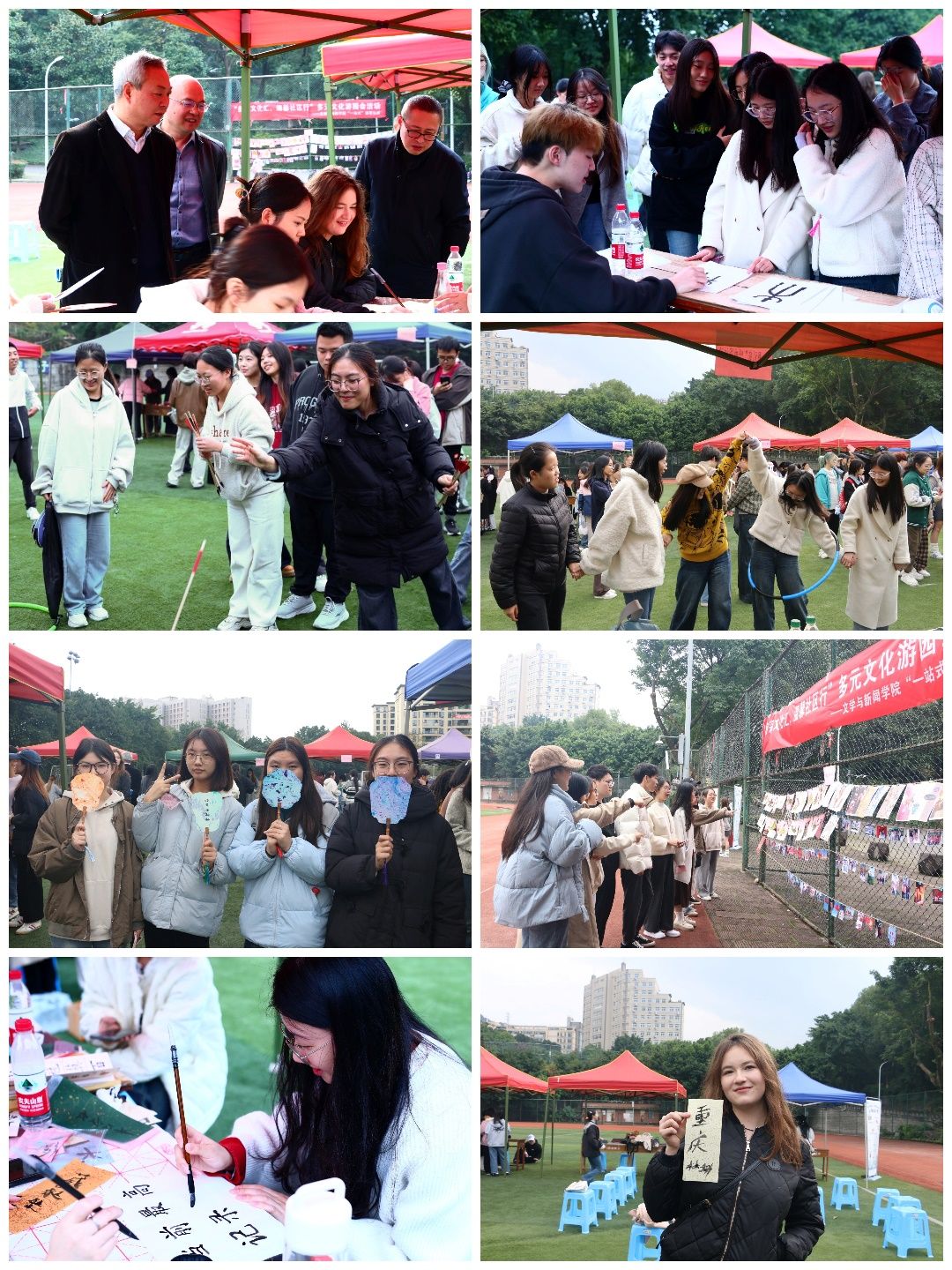 主持人宣布游园会正式开始后,同学们兴致勃勃地在各个项目间穿梭,在“漆扇制作”环节中,同学们充分发挥自己的想象力和创造力,巧妙地将现代时尚元素与传统特色相融合,精心打造出一件件既彰显个性又不失文化底蕴的漆扇作品。在“飞花令”环节中,同学们积极调动自身的诗词储备量,依次吟诵出含有特定字眼的诗句,既展现自我风采,又凸显中华诗词的博大精深。在“投壶”环节中,同学们手拿箭矢,注意力集中,定点瞄准投掷,感受该运动所蕴藏的文体魅力。有的同学驻足于社区优秀作品展前,细细品味落叶创意、摄影佳作等艺术展品。来自乌克兰的职工同学用毛笔写了“重庆”后还高兴的拍照留念;李董事长和老师们也跟同学们一起参与了颠乒乓球、飞花令等活动。在活动中,师生们深切感受到了中华优秀传统文化的独特魅力,文化认同感与自豪感油然而生。