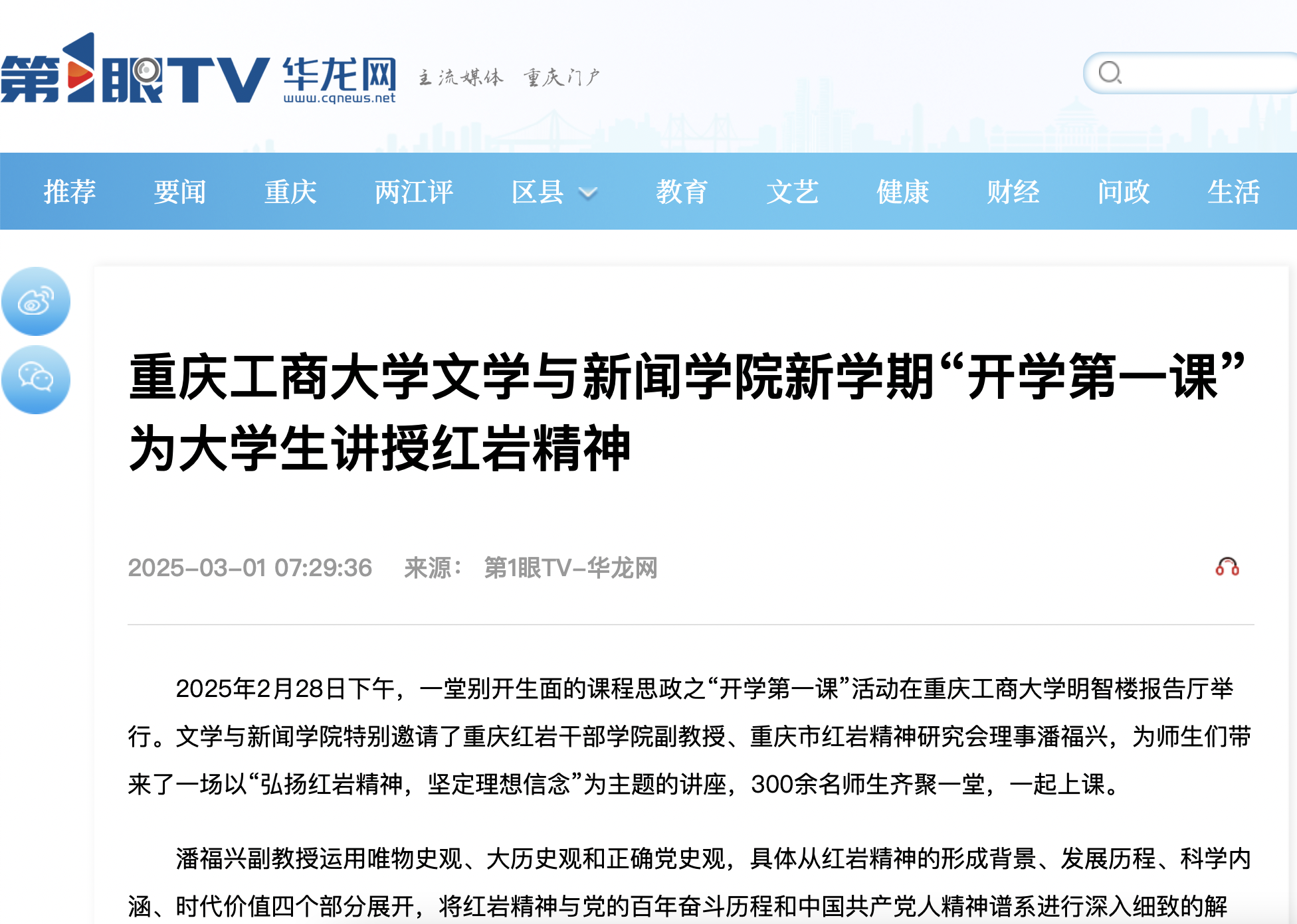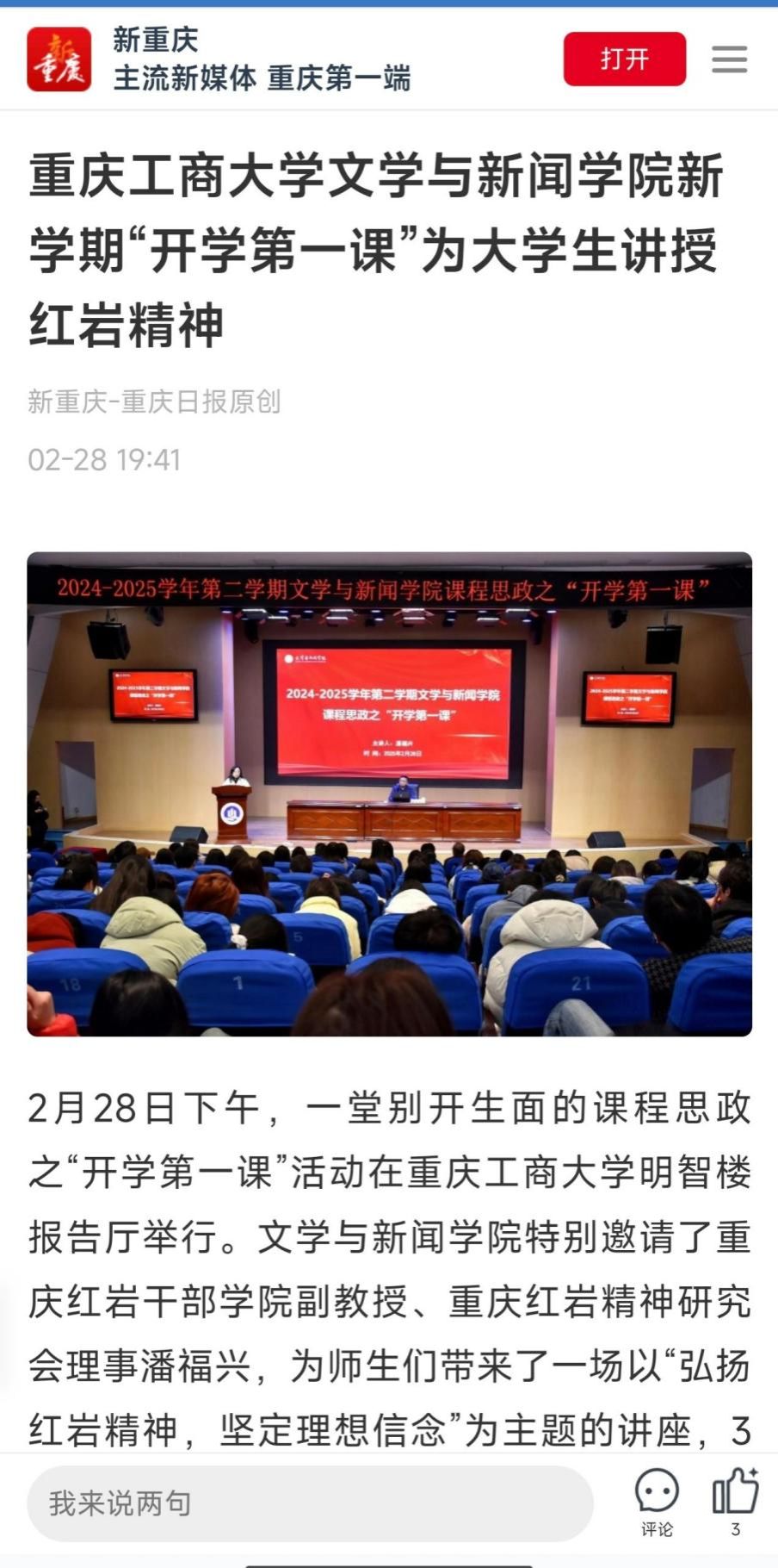 2月28日下午,tyc5997太阳集团课程思政之“开学第一课”活动在明智楼报告厅举行,特别邀请了重庆红岩干部公司副教授、重庆市红岩精神研究会理事潘福兴,为师生们带来了一场以“弘扬红岩精神,坚定理想信念”为主题的讲座,300余名师生齐聚一堂,一起上课。重庆日报、华龙网等媒体对此活动进行了报道。