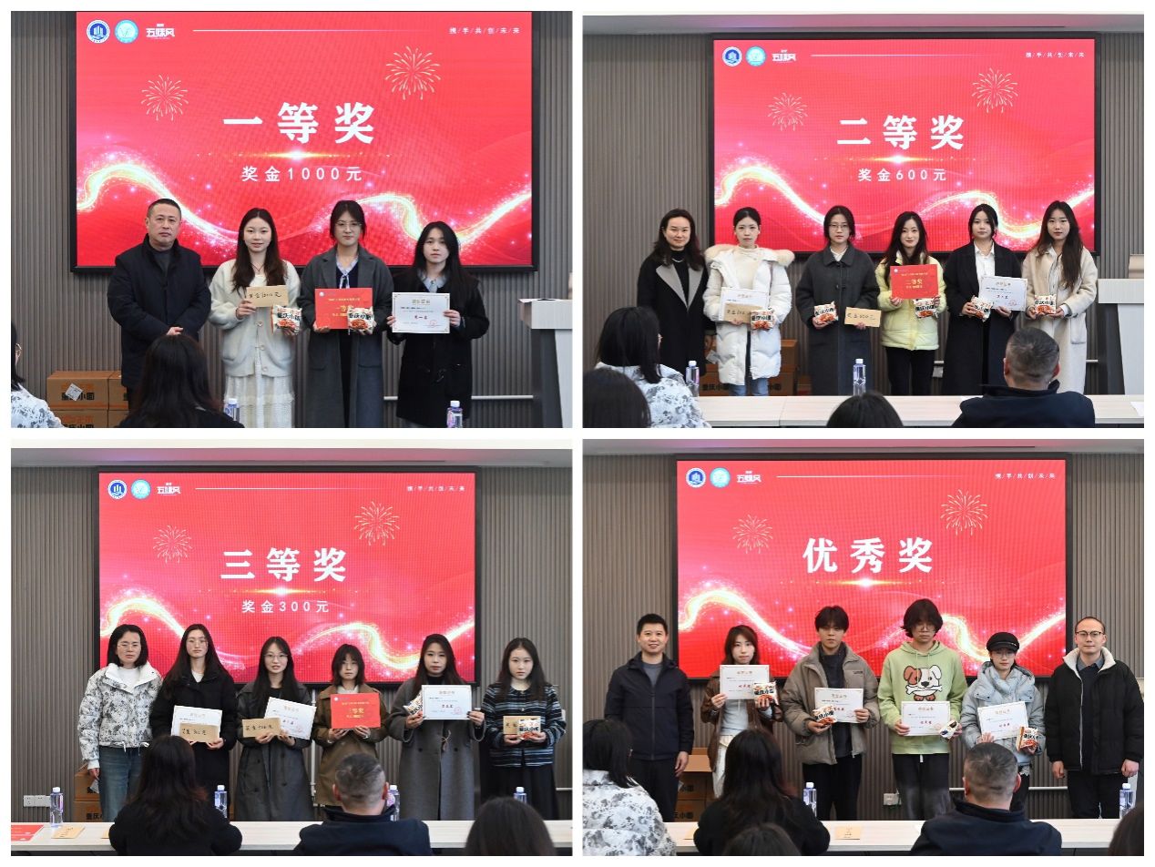 最后,程元元在颁奖典礼总结讲话中指出,本次大赛通过深化校企合作,构建起“创新实践+市场接轨”的育人模式。他强调员工创作需兼具艺术创新与市场价值,以群众喜闻乐见的形式讲好文化故事。同时,现场转达了重庆“渝城”五味风重庆小面店负责人毛开兵老师对获奖团队的祝贺。校企双方表示将持续深化合作,通过拓展实践平台、优化培养机制等方式,为青年学子提供更广阔的专业成长空间。