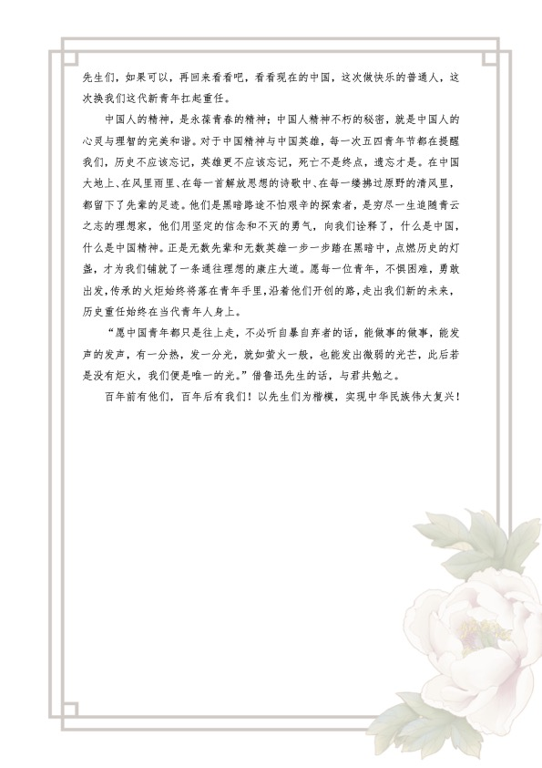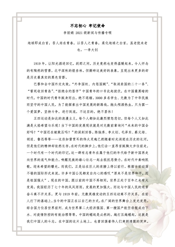 正如习总书记对广大青年的寄语所说,“青年一代有理想、有担当,国家就有前途,民族就有希望,实现中华民族伟大复兴就有源源不断的强大力量”。本次主题征文大赛希望通过回忆历史和青春故事,全院青年研究生能继承和发扬“五四”精神,从百年党史中汲取力量,开拓创新、锐意进取,为新时代建设社会主义发展贡献更多的青春力量和智慧。