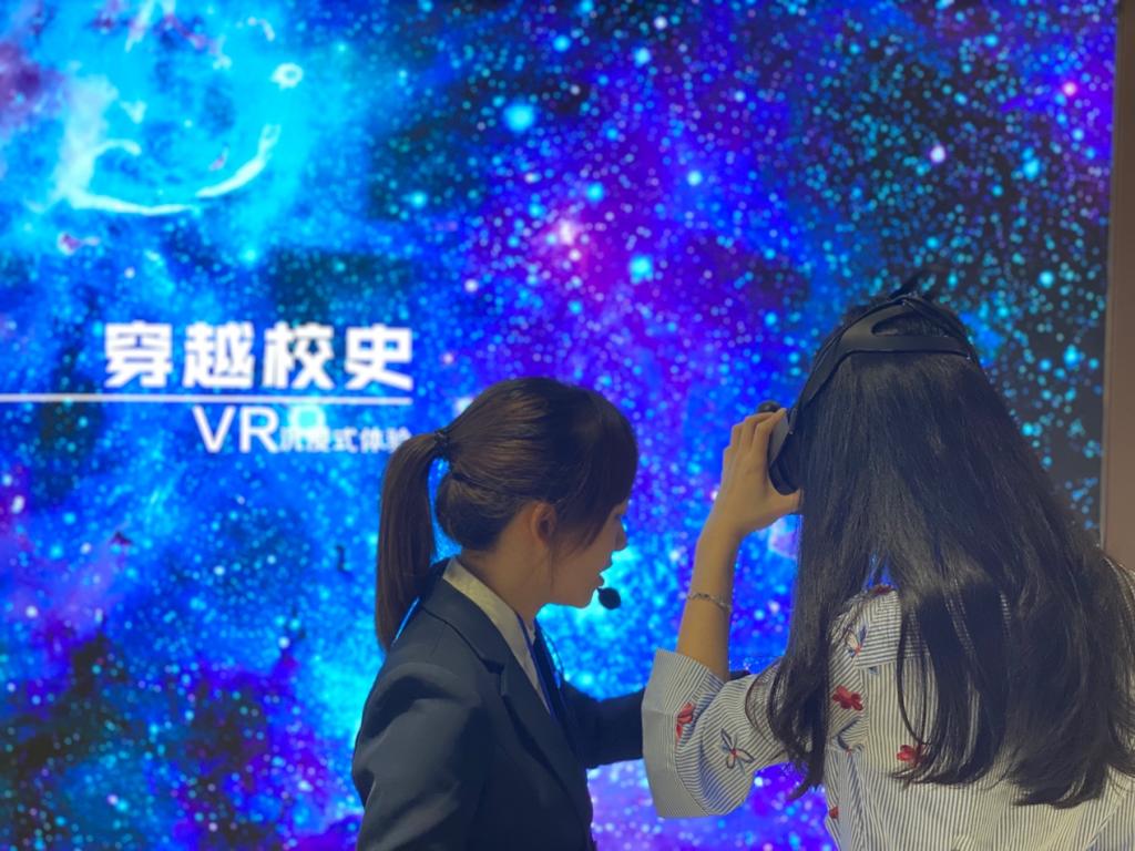 (图片为公司同学体验VR沉浸式穿越校史设备)