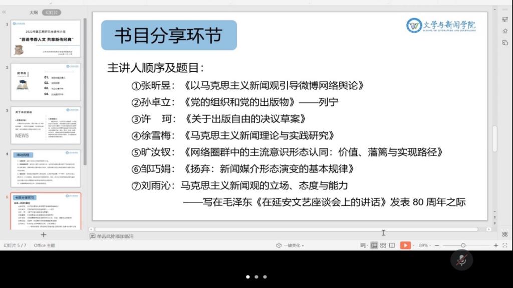 在分享环节,7位主讲人分别对自己阅读的书目内容进行讲解,表达自己的阅读后的感悟。2021级传播学孙卓立分享了列宁著作——《党的组织和党的出版物》,指出列宁的党报思想不仅继承和发展了马克思恩格斯关于报刊的思想,而且为中国共产党的舆论宣传工作提供了重要启示;2022级新闻与传播邹巧娟分享的论文《扬弃:新闻媒介形态演变的基本规律》中提到的媒介形态演进三要素很好地为我们剖析了媒介的解构;2021级传播学许珂带领大家思考马克思主义新闻观在当下如何得到发展,她认为应该从马克思主义新闻思想的原著中去反思,由哲学角度思考;2021级新闻学徐雪梅向大家分享了郑保卫关于探讨马克思主义新闻观和中国共产党的新闻思想实践的一些论文合集;2022级新闻与传播刘雨沁梳理了马克思主义新闻观的立场辨析。