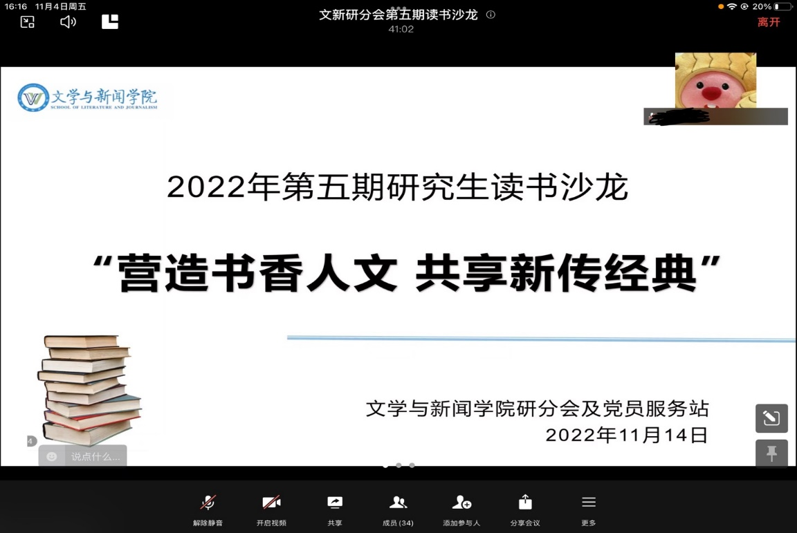 为了给同学们提供一个学术交流的平台,学思践悟马克思主义新闻观,公司研分会于在11月4日下午在线上成功举办了以“营造书香人文 共享新传经典”为主题的第五期读书沙龙活动。本次读书沙龙活动围绕“马克思主义新闻观”进行书籍或文献分享,活动主要分为读书分享环节和交流提问环节,2021级新闻与传播綦婷担任主持。