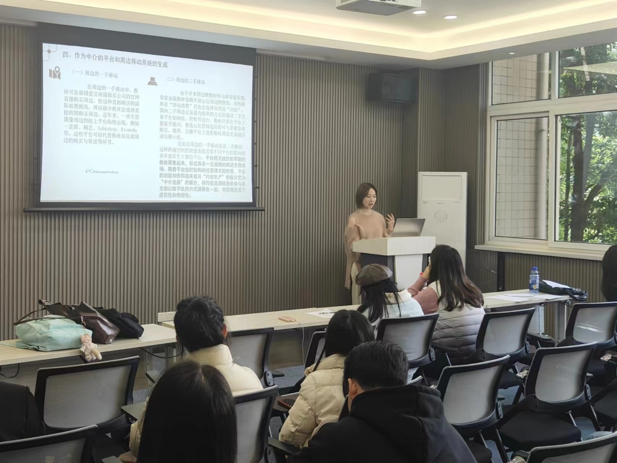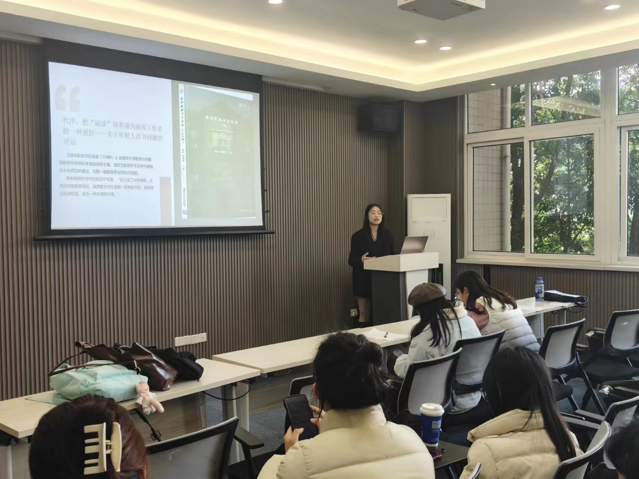 第七位分享人22级新闻与传播万丫丫在论文《作为中介的平台:K-Pop“周边”的移动和粉丝圈层秩序的再造》中指出平台的技术和经济因素引导着用户互动,同时也塑造着社会规范;第八位分享人22级新闻与传播刘雨沁以让·鲍德里亚的《物体系》为分享书目讲述了自己关于“对人的形象的依恋”的理解;第九位分享人22级新闻学王璐璐介绍了《清华新闻书目导读(100种)》并深入讲解了其中一本推荐书目《叫魂——1768年中国妖术大恐慌》。