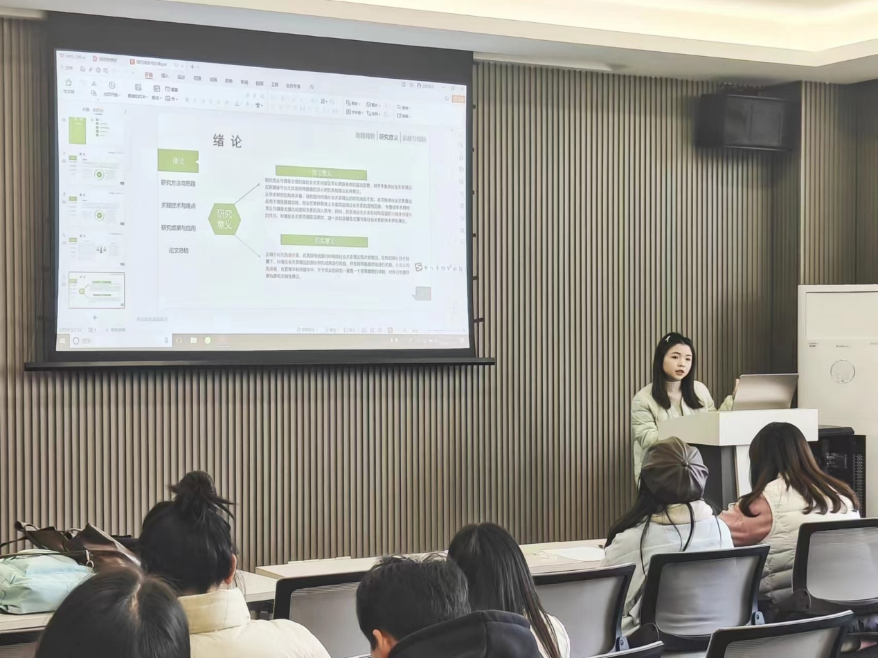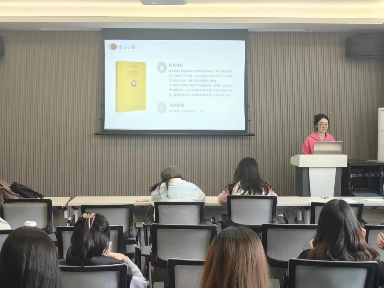 第四位分享人23级传播学杨澜馨向我们分享了《对空言说:传播的观念史》一书,指出“如果我们想要探索交流的问题,我们就不能回避交流失败的处境”;第五位分享人22级新闻学金子琳分享的书目《边界、权威与合法性:中国语境下的新闻职业话语研究》中通过新分析范式以阐释职业话语建构与使用的理论意涵;第六位分享人22级新闻与传播沈奕婷介绍了当今世界知名社会批判理论家哈特穆特·罗萨的《新异化的诞生》,利用身边的例子来解释“加速社会”中的各种“异化”现象。