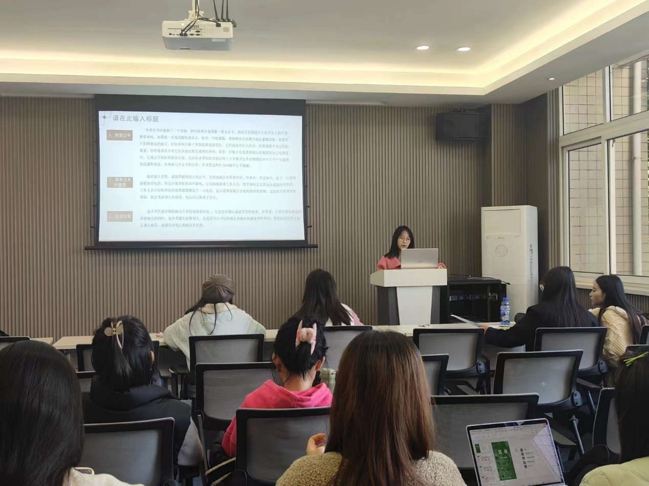 首先,22级新闻与传播张梦诗率先分享了弗朗斯•德瓦尔的《共情时代》一书,提出“共情”这一概念,是一种正能量的感同身受,阅读《共情时代》有助于我们重新审视对于社会达尔文主义和自私的基因的认识;第二位分享人22级新闻与传播邹巧娟以当红健身主播刘畊宏为例,分享了自己对于体育新闻传播方向论文《受众与健身主播准社会关系对健身意愿的影响研究——以刘畊宏为例》的见解和分析,向大家介绍了S-O-R理论模型,思考深入理解深刻;第三位分享人22级新闻与传播杜红玲分享了《新闻业的救赎:数字时代新闻生产的16个关键问题》,并分享了衍生读物《大数据时代》、《做新闻》、《新闻业的怀乡病》、《南方周末特稿手册》。