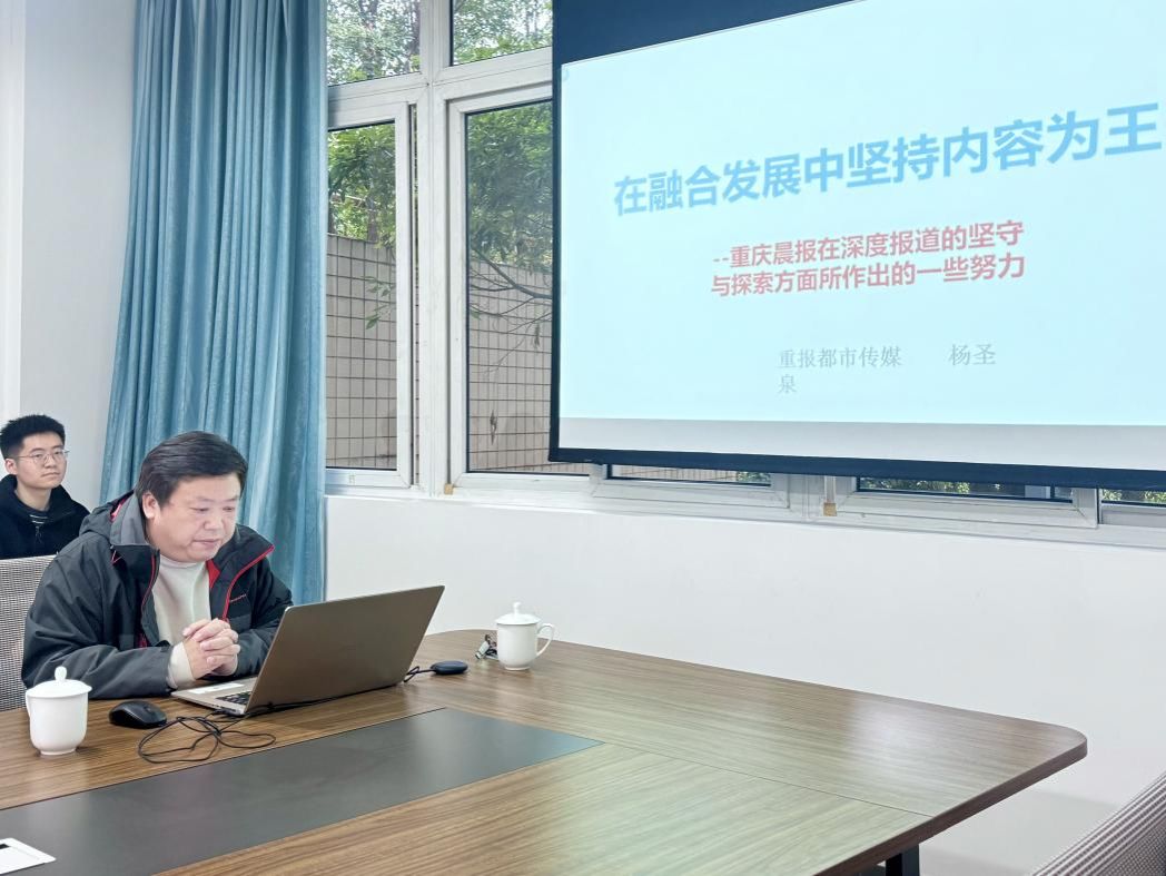 重庆晨报传媒有限公司采访部副主任杨圣泉,以《在融合发展中坚持内容为王》为题,分享了重庆晨报在深度报道的坚守与探索方面所作出的努力。他从“都市传媒”的分分合合、“内容为王”与“原创为重”、内容建设与舆论监督三个方面来展开分享,他指出重报都市传媒以将重庆晨报做成一份“有思想、有深度、有影响力的都市报”为主攻方向,寄语同学们做一名有思想、有见解、敢担当的新闻人。