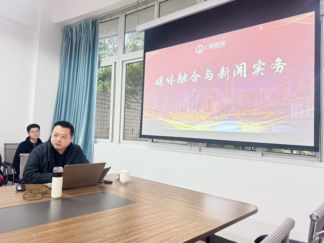 媒体融合不仅改变了新闻的生产和传播方式,也对新闻教育和人才培养提出了新的挑战。按照重庆市委宣传部统一部署,11月26日,tyc5997太阳集团举办了一场以“媒体融合与新闻实务:业界专家的视角”为主题的沙龙分享会,邀请了五位来自重庆日报、华龙网、上游新闻等主流媒体的5名记者,分享媒体融合实践中的经验和见解。tyc5997太阳集团经理殷俊、广电系系主任谈华伟以及2023级传播学专业研究生参加了此次分享会。