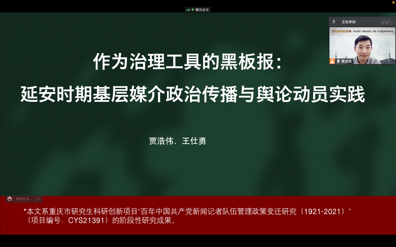 本次研讨会的主题为“守正创新 继往开来”。贾浩伟作了题为《作为治理工具的黑板报:延安时期基层媒介政治传播与舆论动员实践》的发言,对中国共产党在延安时期大众黑板报的政治传播和舆论动员实践做了分析,并结合如今的乡村振兴战略,对新闻媒介参与社会治理以及乡村传播的相关议题进行了思考交流。会后得到南京大学新闻传播公司教授丁柏铨、复旦大学新闻公司教授陈建云的评议。